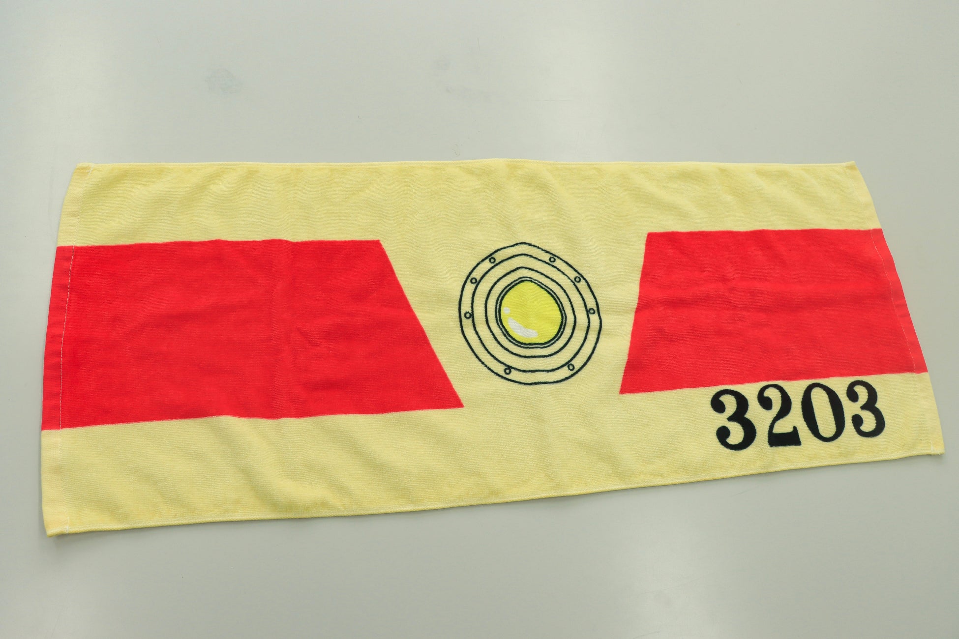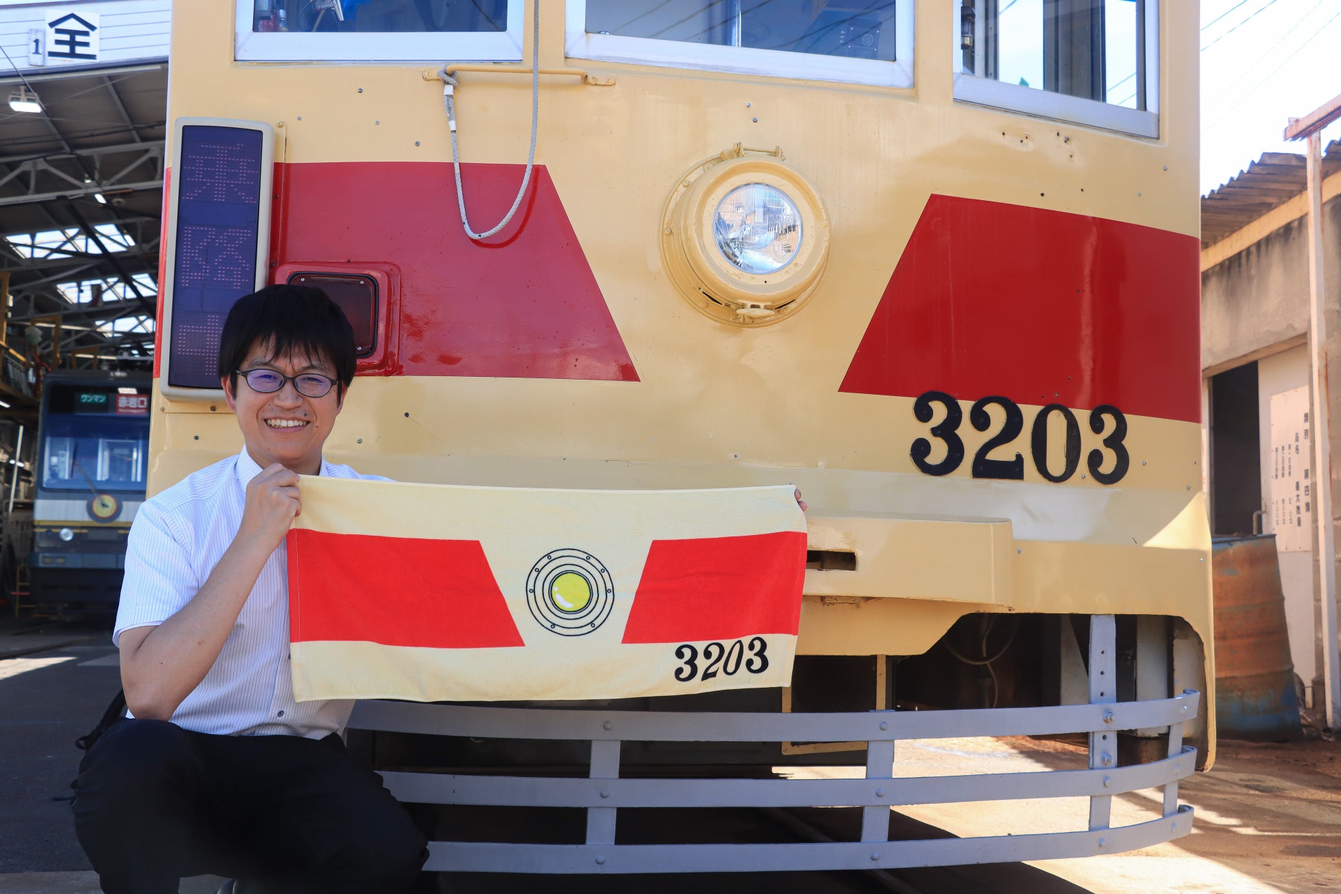 内容:市内線3203号の顔をモチーフにしたフェイスタオル(サイズ:34㎝×84㎝)