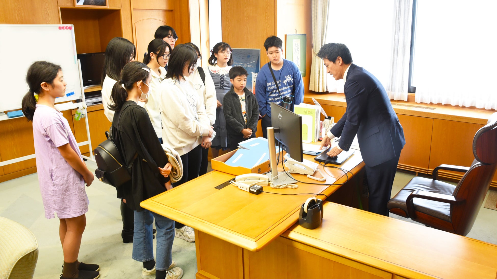 最後は普段なかなか入ることのできない市長室の見学ツアーも実施し、市長のお仕事紹介もあってこども・若者たちは興味津々。市長の椅子にも希望者が座ってみるなど、貴重な1日となりました。