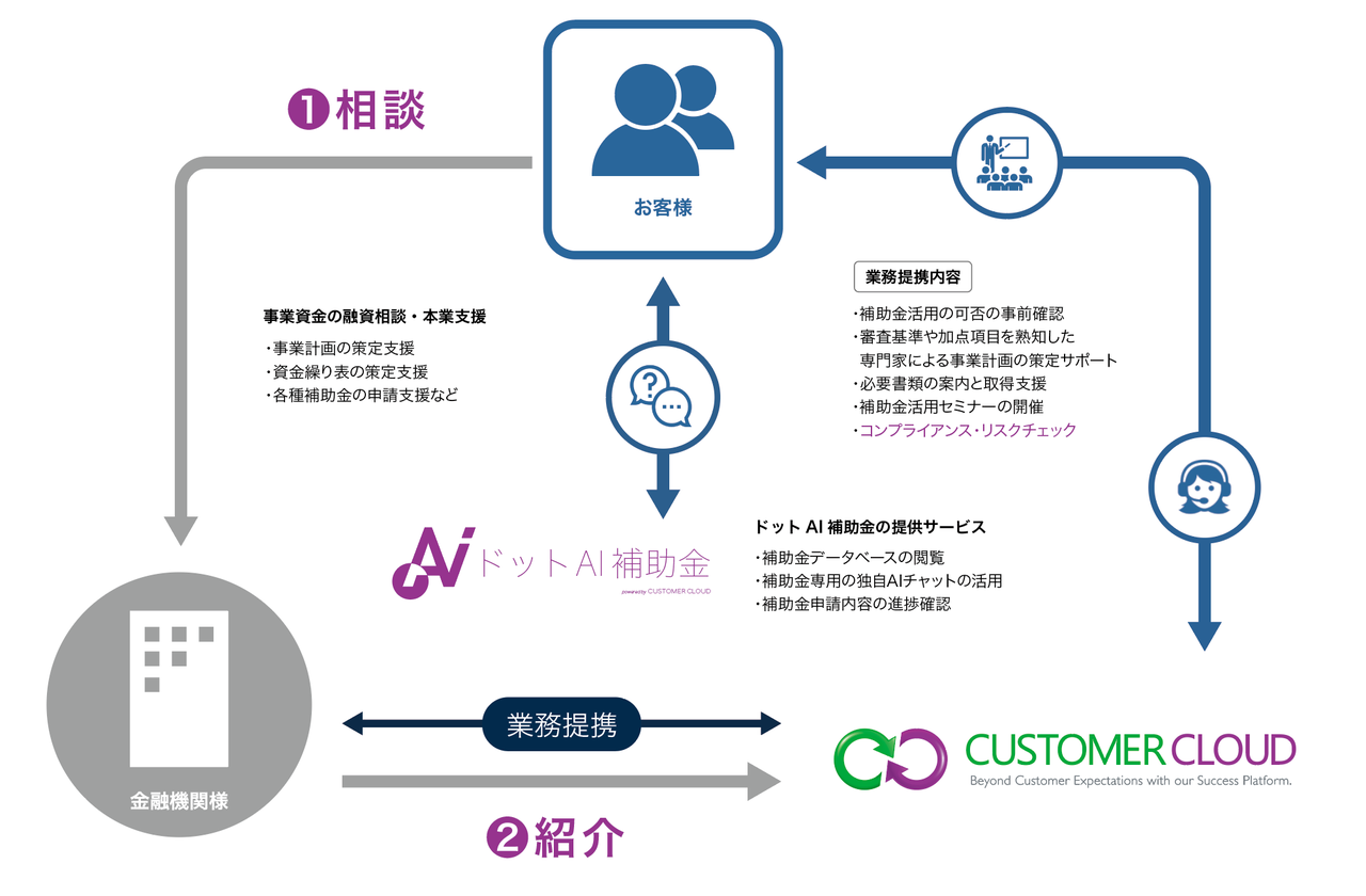 パートナー企業がお客様から補助金申請に関するご相談を承った際、お客様の同意を得てカスタマークラウドの専門家による申請支援サービスをご紹介いたします。
