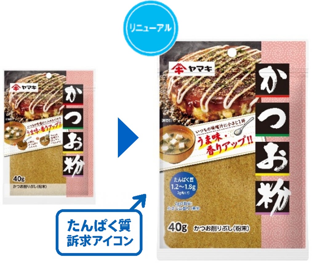 近年、健康志向や環境意識の高まりにより、毎日の食事でも“おいしさ”とともに“体や地球へのやさしさ”を重視する生活者が増えています。こうした社会の変化を受け、ヤマキでは「かつお粉40g」「けずり粉45g」のパッケージを、環境に配慮した仕様に変更するとともに、たんぱく質含有量を分かりやすく伝えるデザインに改良しました。