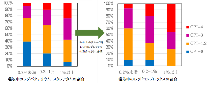 左:図1a フゾバクテリウム・ヌクレアタムの唾液中の割合とCPIの関係 右:図1b フゾバクテリウム・ヌクレアタムの唾液中の割合が高いグループ(≧1%)におけるレッドコンプレックスの割合の違いとCPIの分布