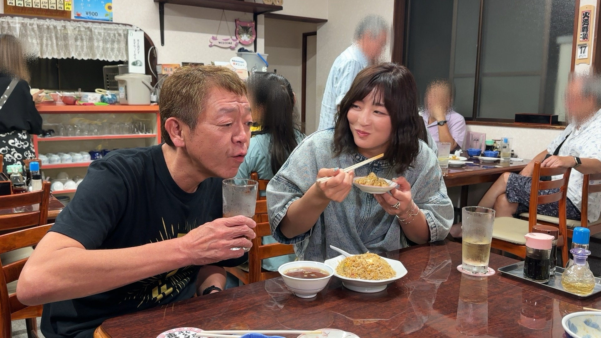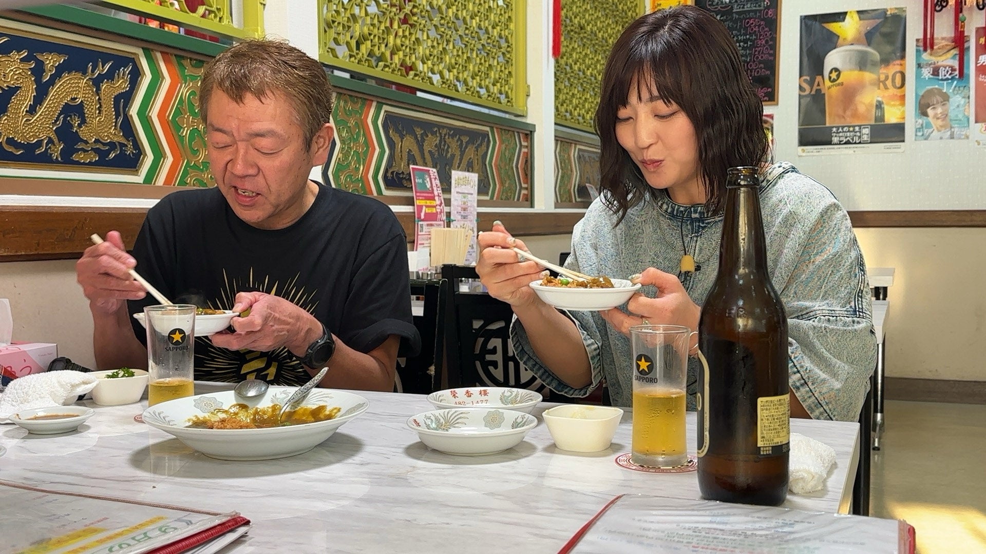 京成本線の「勝田台」で角田夏実と合流した玉袋筋太郎。町中華で一杯やる前に角田の母校・八千代高校へ寄り道します。町ですれ違う人が「頑張ってね」と角田に声をかけるのを見て、改めて地元の大スターだと実感する玉袋。そんな2人が1軒目に訪れた「栄香楼」も、女将が角田の大ファン。応援グッズを使った熱烈な歓迎を受けます。「栄香楼」は創業51年の町中華。高度成長期前から八千代市で営業を続けていて、子供に渡す無料のおもちゃ”町中華のハッピーセット“を常備するなど、家族連れに愛されているお店です。まず2人は、瓶ビールの大瓶を注文し乾杯。”金メダリストで柔道の黒帯“角田が、“町中華の黒帯”である玉袋に、町中華の良さを教えてもらいながらも、たっぷり飲っちゃう1時間です。
