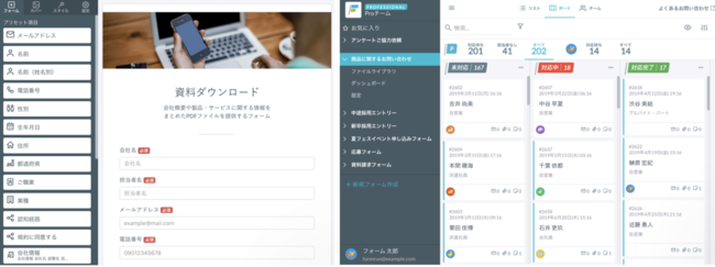 また、フォームの回答をカンバン方式で管理し、顧客対応状況を可視化できます。それぞれの回答に対し、メール送信や対応した担当者の設定が可能なため、チームで効率的にフォームへの回答を管理できます。