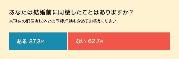 全体では「同棲したことがある」と答えた方が37.3%、「同棲したことがない」と答えた方は62.7%という結果になりました。既婚者208名では、「同棲したことがある」59.1%、「同棲したことがない」40.9%となり、特に20代既婚者に限っては、68.3%と約7割の方々が同棲を経験しているようです。