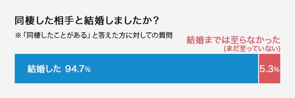 「同棲したことがある」と答えた方に対して、「同棲した相手と結婚したか」を尋ねると94.7%と圧倒的に多かったです。共同生活を送ることでふたりの絆が深まり、お互いを助け合える関係性が少しずつ育っていくものなのかもしれません。