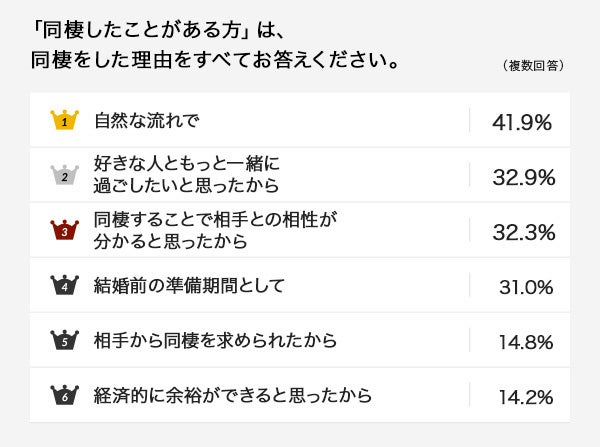 「同棲したことがある」と答えた方は全体のうち37.3%。既婚者208名においては「同棲したことがある」59.1%、さらに20代既婚者に限っては、68.3%と約7割の方々が同棲を経験しているようです。同棲の理由は、1位「自然な流れで」、2位「好きな人ともっと一緒に過ごしたいと思ったから」、3位「同棲することで相手との相性が分かると思ったから」という結果になりました。