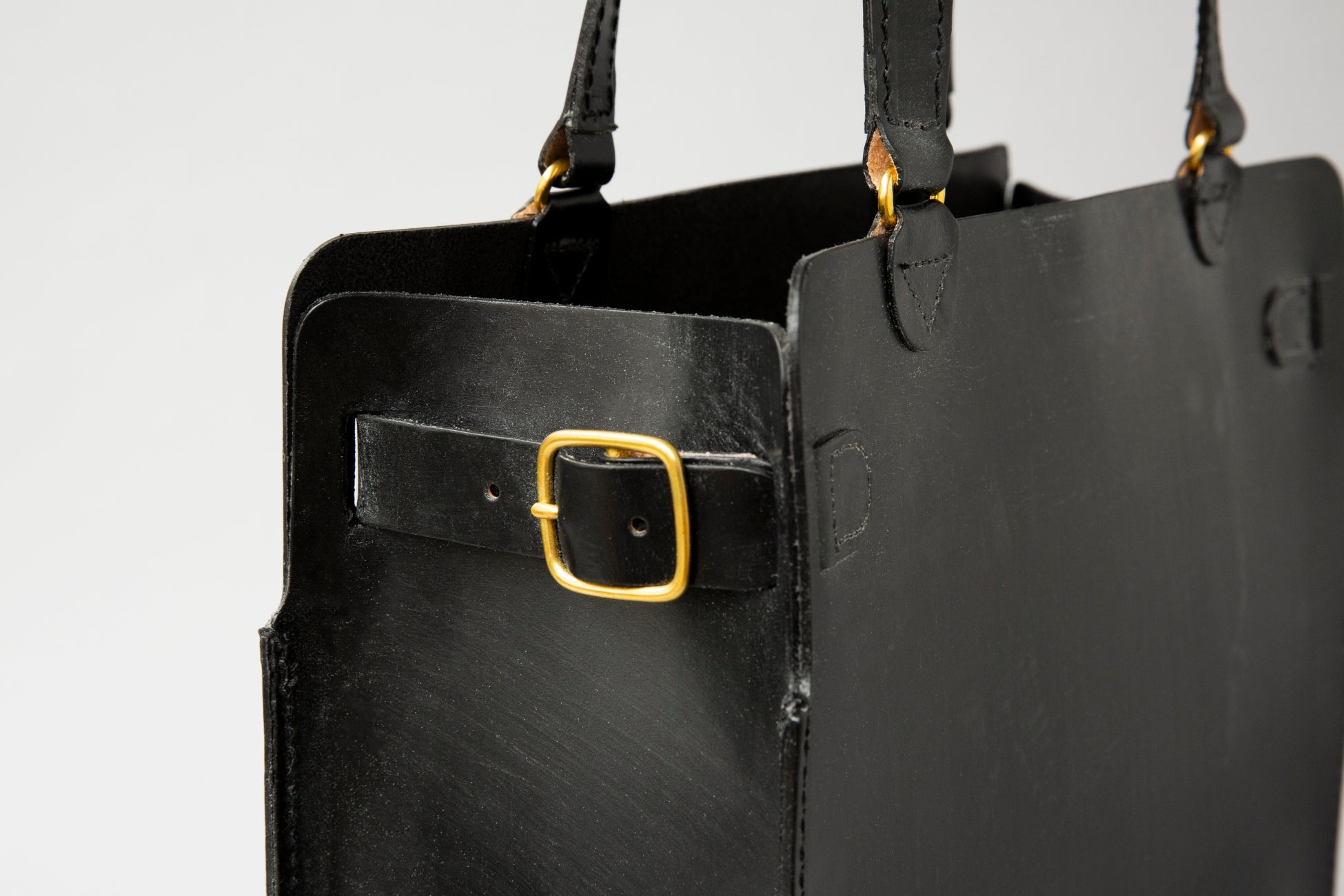 今回登場したトートバッグは、真鍮製のサイドベルト付きの珍しいデザインが特徴です。全体のアクセントになるほか、ベルトを締めることでマチの間隔を調整し、コンパクトに演出。また、バッグの開口部の微調整ができる機能を備えています。
