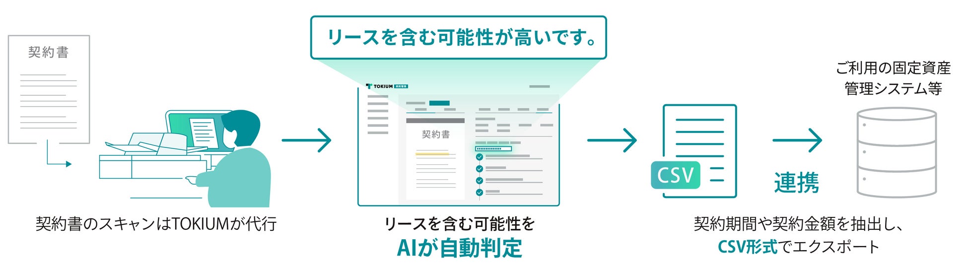 「TOKIUM契約管理」は、締結済みの契約書を一元管理するクラウド契約管理システムです。すべての契約書を電子化してAI-OCRによる全文文字起こしのほか、2027年4月以後に開始する会計年度より強制適用となる「新リース会計基準」においてリースに該当するかどうかをAIが自動判定する機能を有しています。
