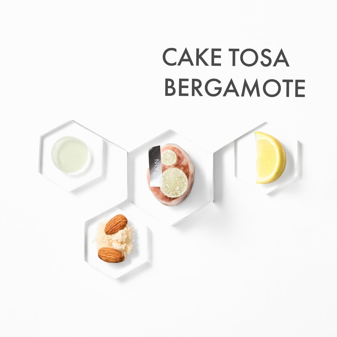 高知県産ベルガモットのコンフィチュールを練り込んだアーモンド生地に、ベルガモット果汁とジンで仕立てたシロップをしっかり染み込ませ、しっとりとしたケークに仕上げました。酸味の効いたグラスロワイヤルのコーティングで生地のしっとりさをキープ。トップのベルガモットのパート ド フリュイは、見た目の華やかさに加え、酸味や食感のアクセントにもなっています。