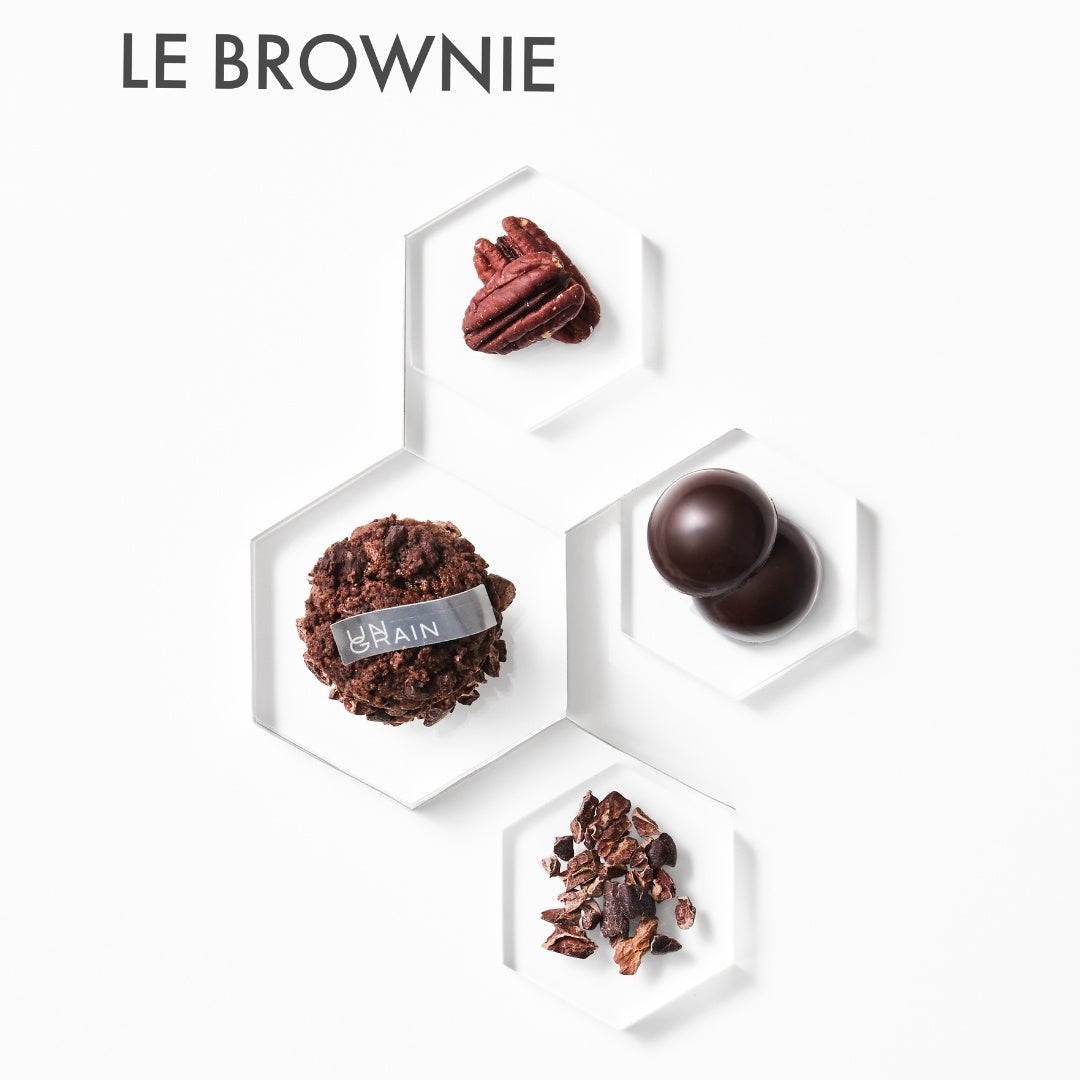 ビターチョコレートを使用し、季節を問わずお楽しみいただける軽やかなブラウニー。生地には、食感のアクセントとなるローストしたペカンナッツを加え、トップには塩味の効いたチョコレートサブレをあしらい、これぞブラウニーと思える満足感のある一品に。表面に散りばめられたカカオニブが、カカオ本来の風味を引き立てます。