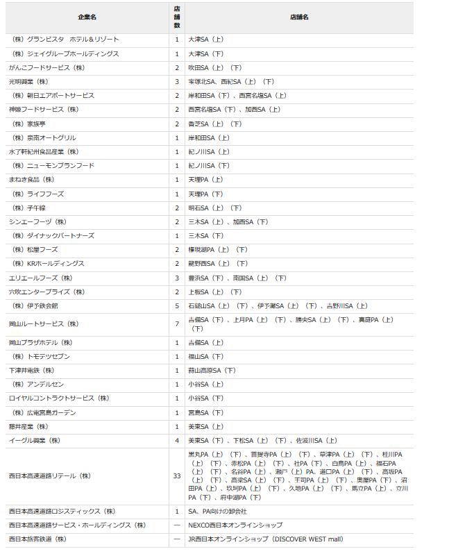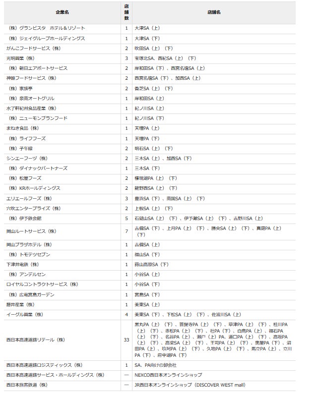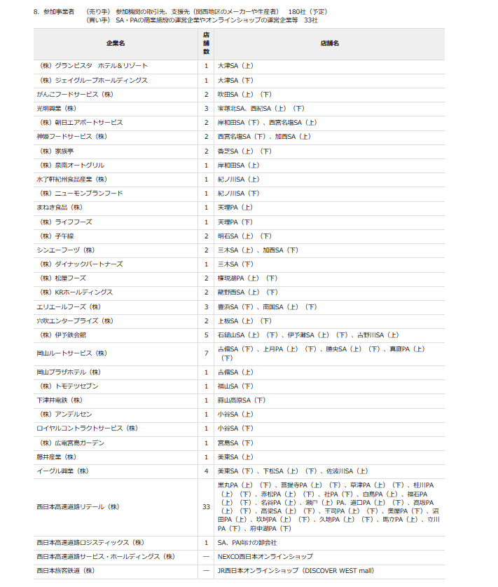 (買い手) SA・PAの商業施設の運営企業やオンラインショップの運営企業等 33社