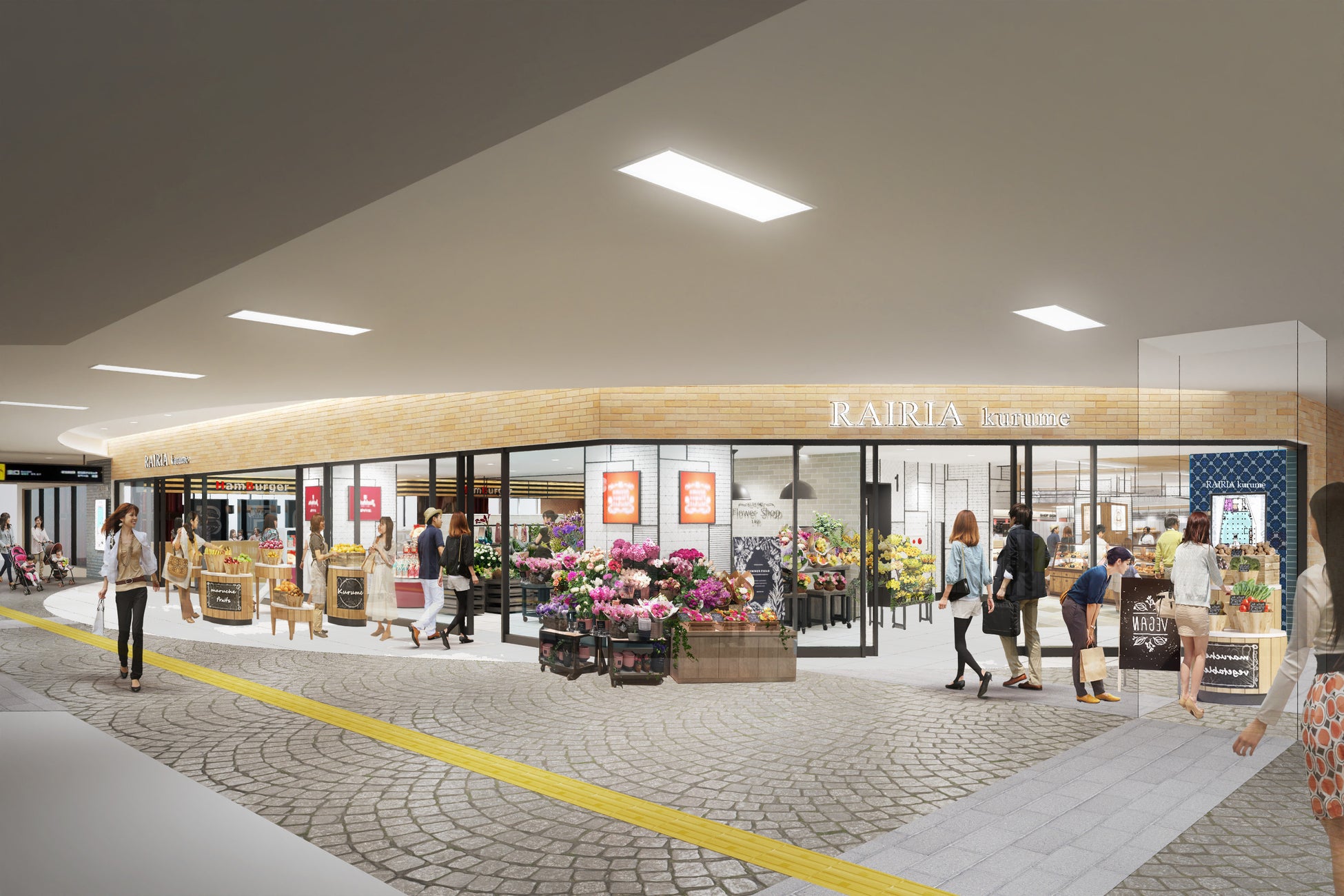 バスセンター内店舗を増床し、飲食コーナーの更なる充実を図ります。また、ファサードの仕様を揃え、店舗東側の壁をガラス面に変更し店舗入口を設けることで、駅東側の環境改善に努めます。さらに、東口広場では、久留米市中心市街地の活性化を目的に、地域の法人や百貨店、商店街が連携して各種施策に取り組む(一社)We Love 久留米協議会と協力してイベント等を行い、駅周辺の賑わい創出に努めます。