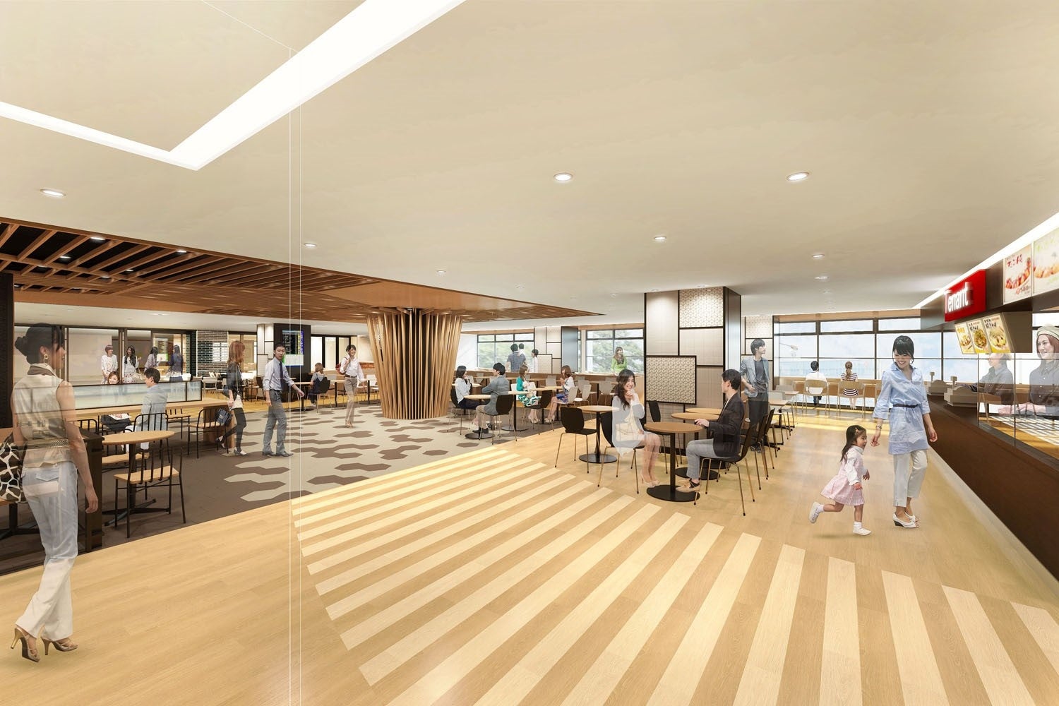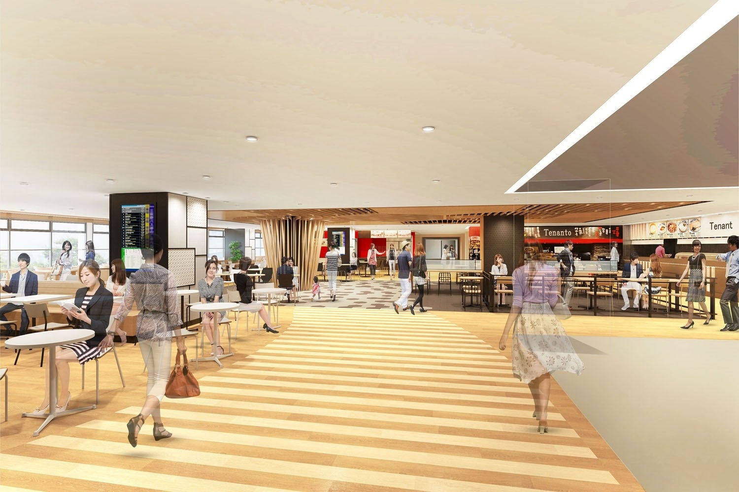 2階北側の飲食店街「味のタウン」にフードコートを新設し、幅広い層のお客さまに気軽にお越しいただける施設にします。フードコート内には、バスや電車の運行状況を表示するデジタルサイネージを設置し、バスや電車にご乗車のお客さまも待合スペースとしてご利用いただけるなど、商交連携してお客さまの利便性向上を図ります。あわせて、1階にある定期券販売所をバスセンターと電車駅改札の動線上に移設し、視認性を高めます。