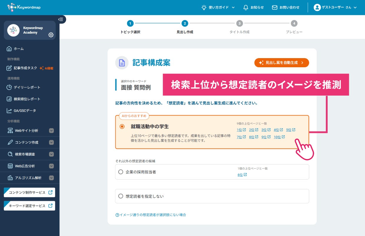選択した想定読者にあわせて、見出し案が自動生成されます。