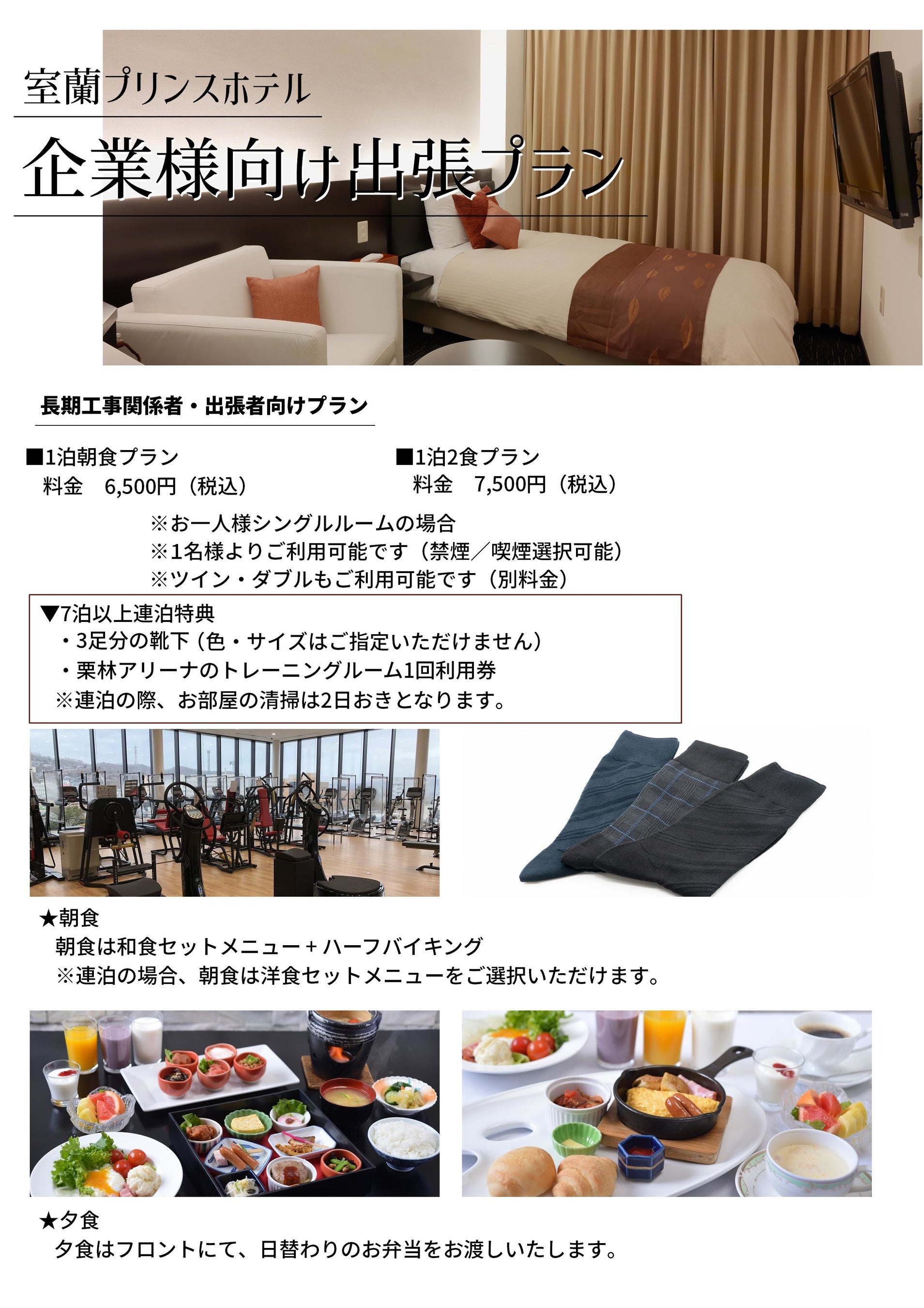 北海道室蘭市にございます室蘭プリンスホテルでは、2022年6月より長期工事関係者、長期滞在の出張者向けの企業様向け出張プランをご用意いたしました。