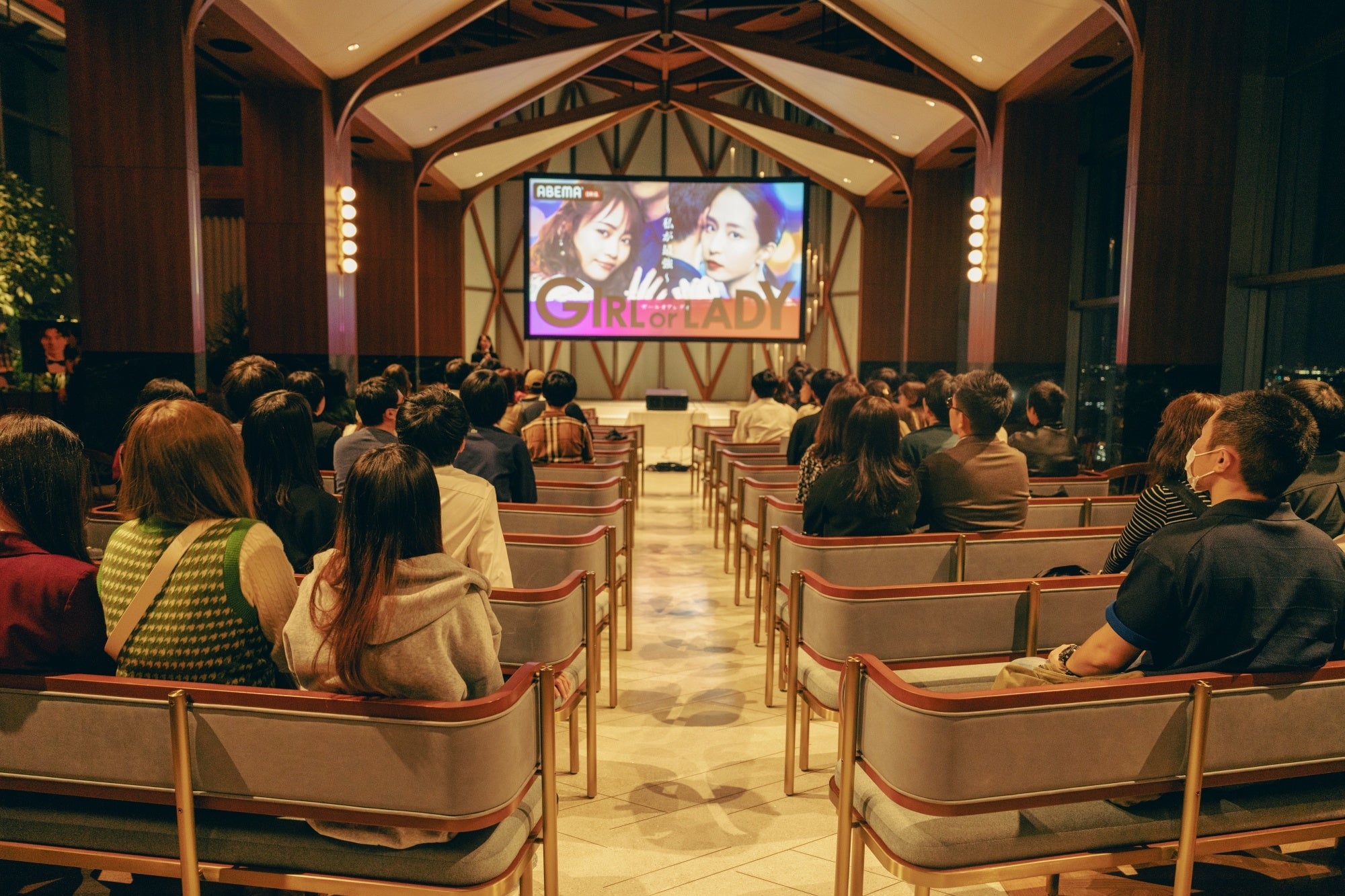 本イベントでは、普段は結婚式の場所として使われている会場が一夜限りでシアターになり、新しい未来のテレビ「ABEMA」のオリジナル婚活サバイバル番組「GIRL or LADY ~私が最強~」(番組公式HP:https://abema.tv/lp/girlorlady-onair)の最終回を、一般放送よりも1日早い2023年10月28日(土)に先行上映いたしました。