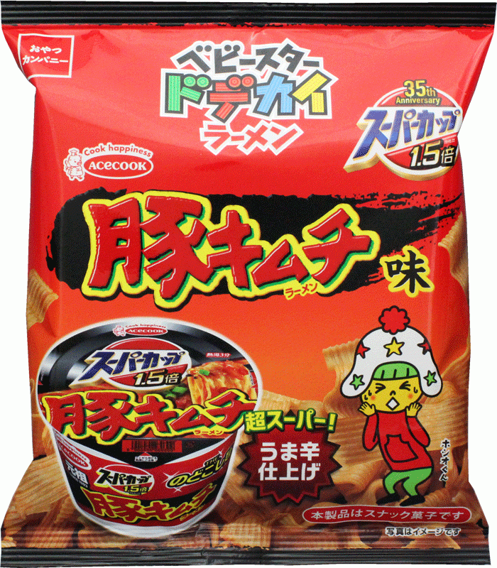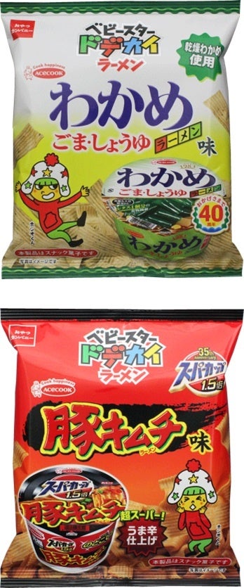 株式会社おやつカンパニー(所在地:三重県津市 代表取締役社長:手島文雄)は、エースコック株式会社(所在地:大阪府吹田市 代表取締役社長:村岡寛)とのコラボ企画商品として、『ベビースタードデカイラーメン(エースコック わかめラーメン味/豚キムチ味)』2品を、2023年4月17日(月)より全国にて発売します。