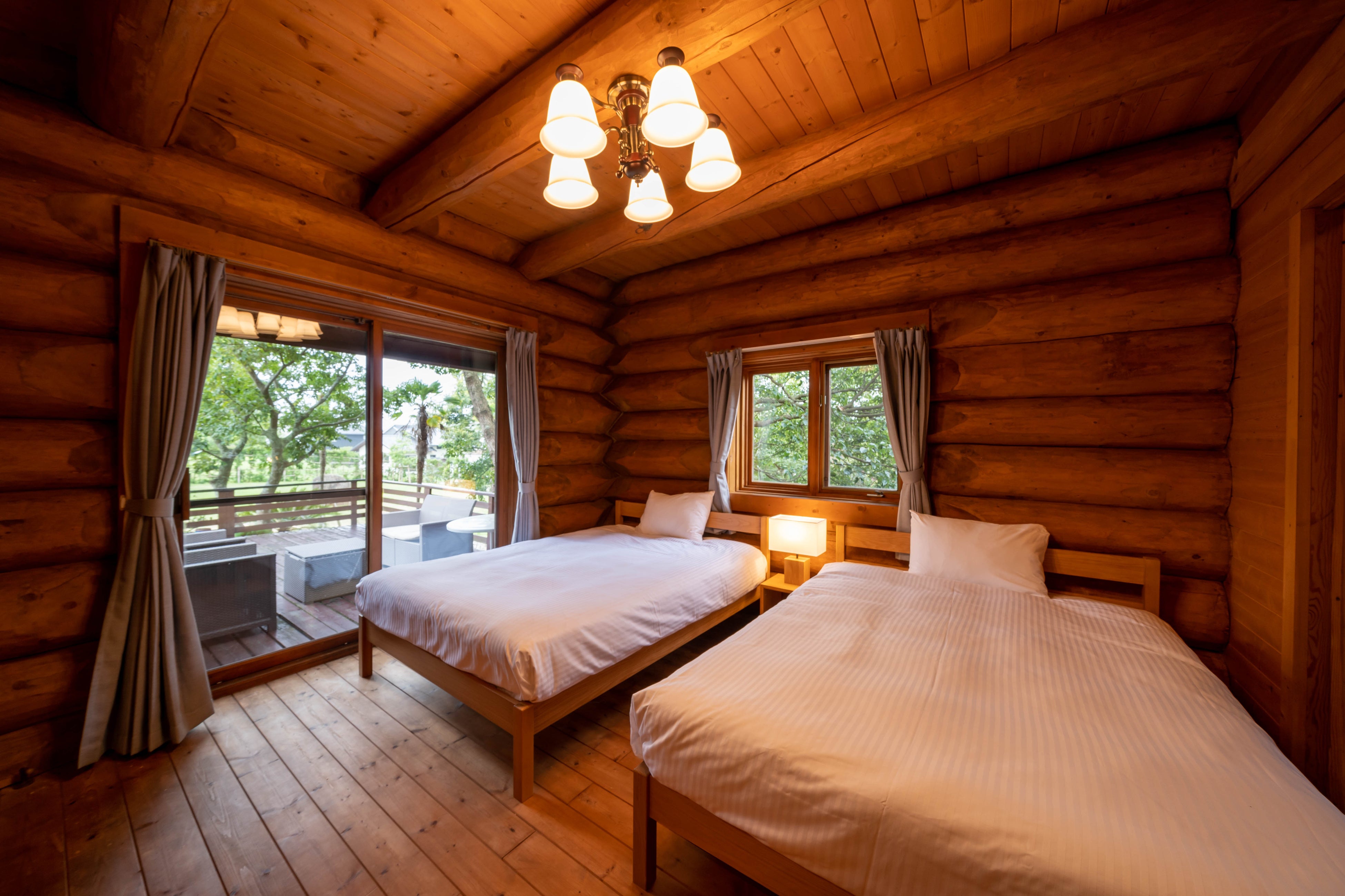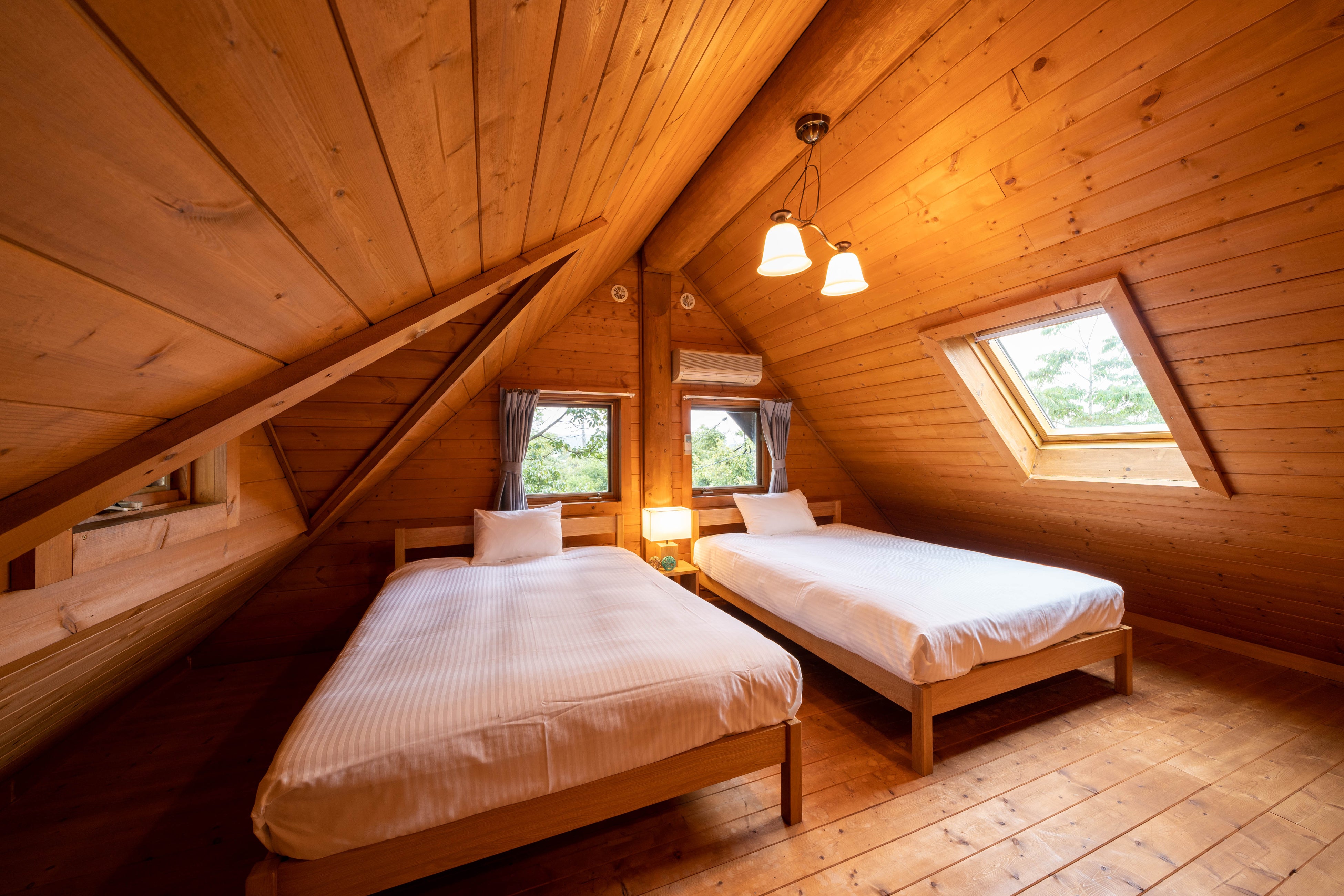 ベッドはゆとりあるクイーンサイズ。1階と2階に合計5台ご用意しています。