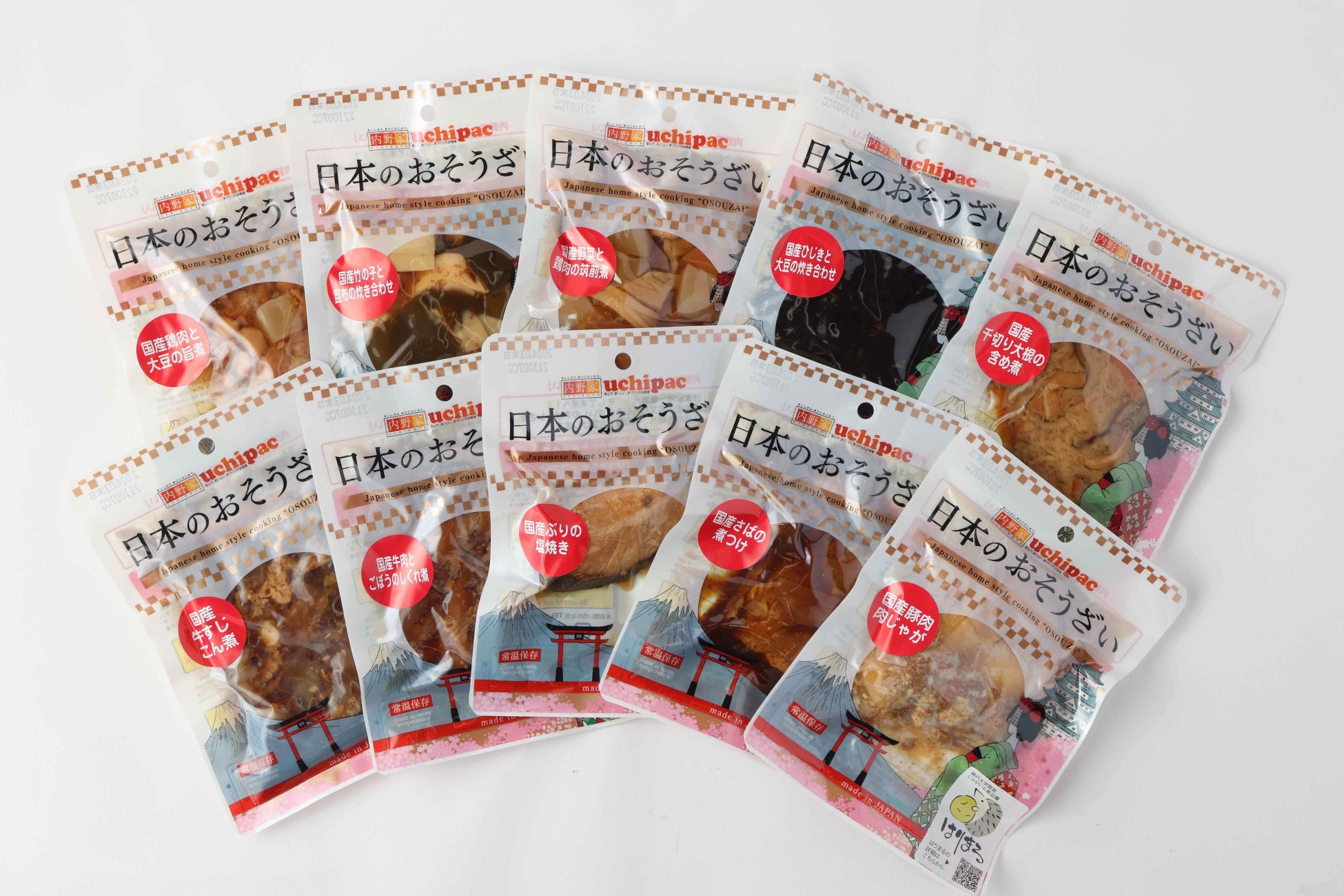 有限会社ウチノが提供する「uchipac(ウチパク)」は、常温保存が可能で、賞味期限は製造から1年7か月です。化学調味料・着色料・保存料は一切使用せず、日本で生産された農産物を主原材料に製造しています。肉じゃがやサバの煮つけなど、約50種類の品目を取り揃えています。