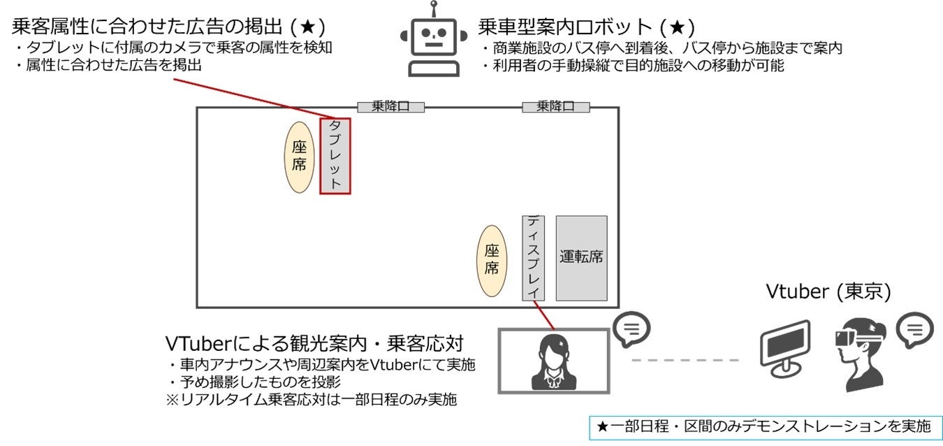 本実証では、自動運転バスの走行・通信制御に関する技術検証とは別に、利用者の移動体験に着目したサービス連携の検証もあわせて実施します。本取り組みは、地域社会DX推進パッケージ事業(自動運転レベル4検証タイプ)とは異なる枠組みで行うものであり、視覚障がい者支援や商業施設での案内ロボット連携、VTuberによる車内アナウンス、乗客属性に応じた広告サイネージといったサービスを通じて、より快適で魅力的な移動体験の実現をめざします。これらの機能は、VTuberによる車内アナウンスを除き、実証期間中の一部日程にてデモンストレーション形式で提供します。なお、本取組は東京スクールオブミュージック&ダンス専門学校 高等課程、東京デザインテクノロジーセンター専門学校 高等課程、AWL株式会社、株式会社Impact mirAIからの提供・支援を受けて実施しています。