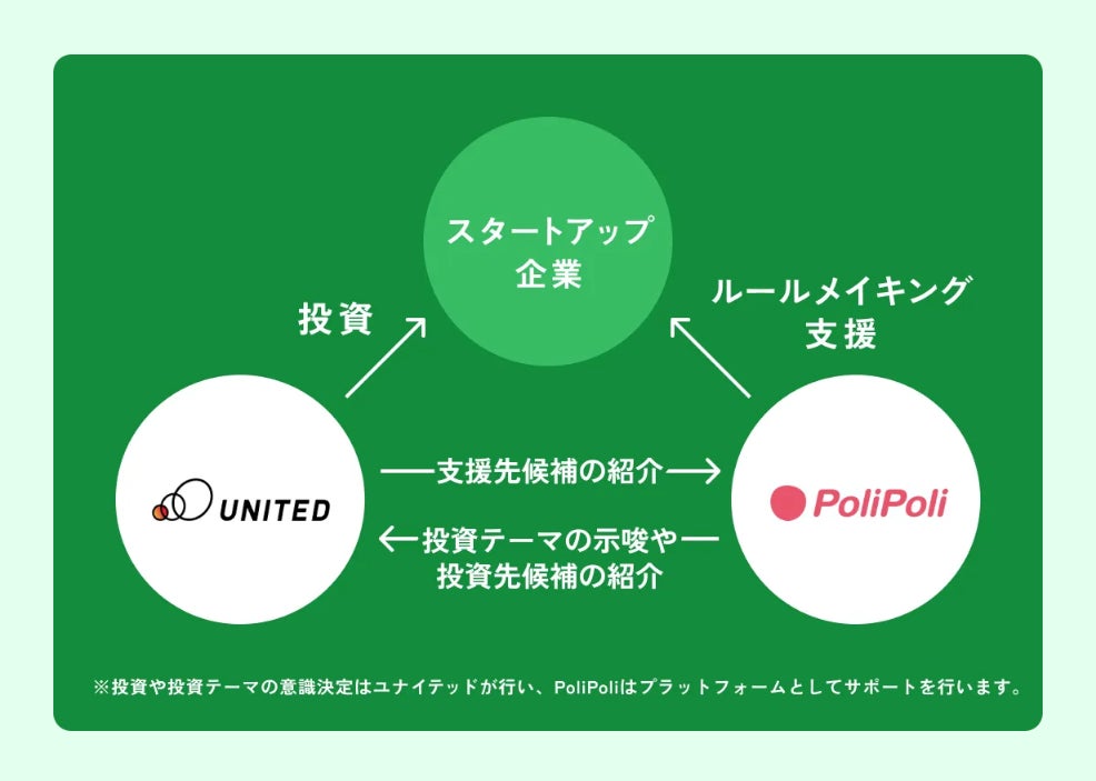 ユナイテッドとPoliPoliは、今後連携を強化し、ユナイテッドの「善進投資」と国策へ関連した事業を行うスタートアップへの投資、投資先企業の政策提言を含めたルールメイキングの伴走支援において事業連携を拡大していきます。PoliPoliの政策分析力や政治・行政とのコネクション、ユナイテッドの投資実績や幅広いネットワークを掛け合わせることで、スタートアップに対して国策と連動したビジネスチャンスを提供し、その実現をサポートしていきます。