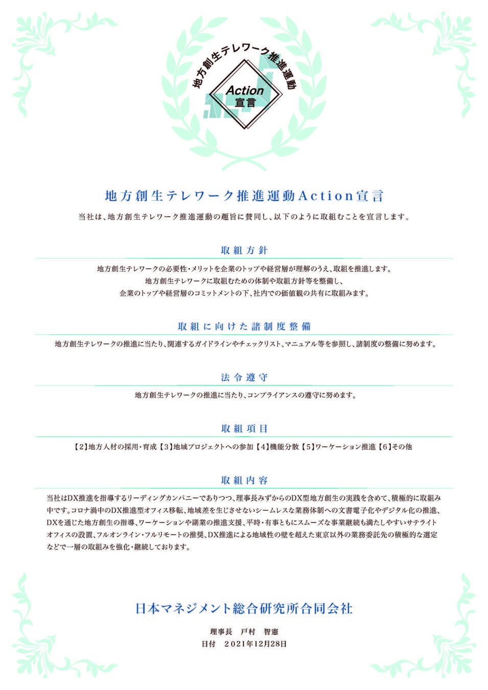 内閣府の依頼を受け「地方創生テレワーク推進運動」に参画し正式にAction宣言が発行されました【日本マネジメント総合研究所合同会社】