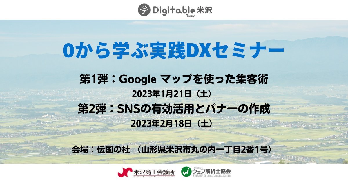 地方の中小零細企業のデジタル課題は深刻です。一般社団法人ウェブ解析士協会と米沢商工会議所は無料セミナー「Digitable Town米沢」を2回開催します。中小企業・個人事業主向けに、デジタル技術になじみのない方でもすぐに取り入れていただける内容です。当日の取材を心よりお待ち申し上げます。