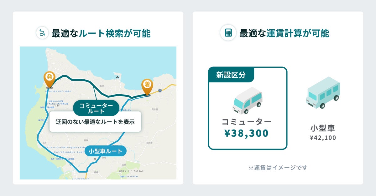今回の対応により、コミューターの車高・車幅・重量規制等を考慮したルート検索と、検索したルートの距離や所要時間をもとに適正な運賃計算が可能になります。これまで小型車設定などで迂回していた運行ルートはコミューター向けに最適化され、またコミューターの下限値を反映した適切な運賃で計算、見積書を作成できるようになります。