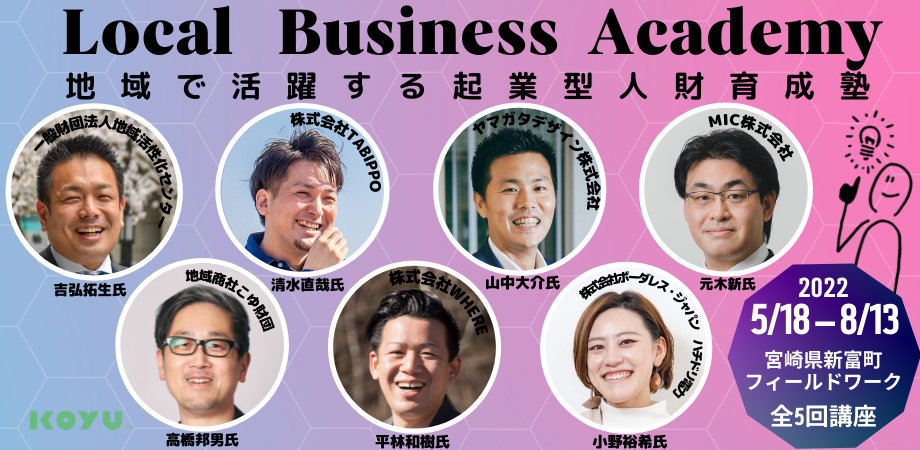 一般財団法人こゆ地域づくり推進機構(宮崎県児湯郡新富町、代表理事:齋藤潤一、以下こゆ財団という)は、本年5月より起業型人財育成事業として「宮崎ローカルビジネスアカデミー」を開講します。自身で事業を産み出すことに興味関心のある日本全国の人々に向けて講座を実施し、宮崎県新富町への移住を促進、地域おこし協力隊100名採用に向けての取り組みをスタートします。