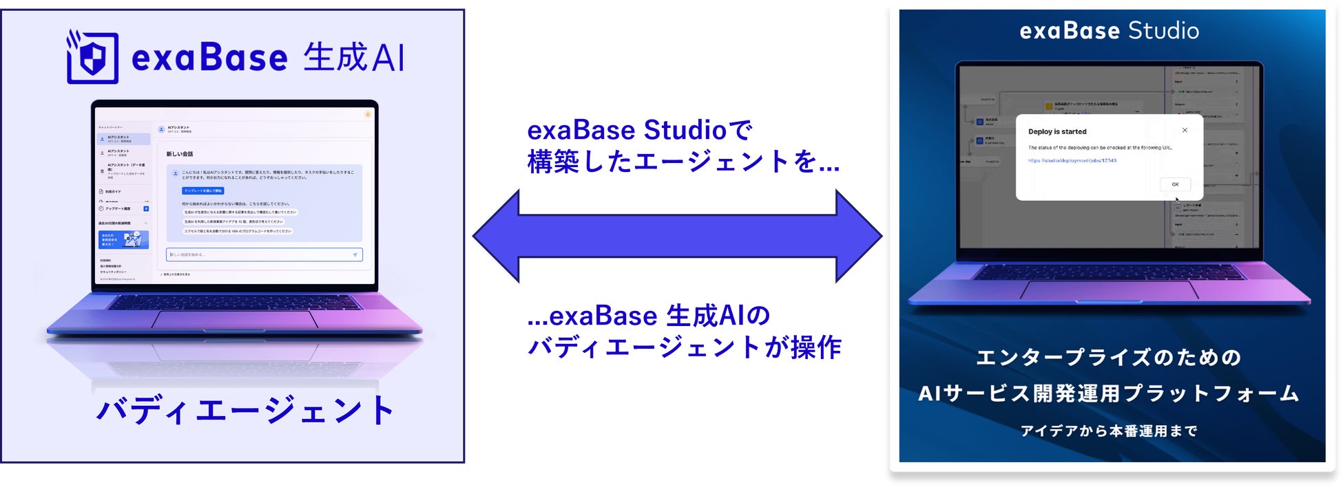 AIエージェント開発・運用プラットフォームである「exaBase Studio」と連携することで、企業が必要とするAIエージェントを「オーダーメイド」で作ることができます。作ったAIエージェントを、バディエージェントが操作することで、より利便性が高くなります。