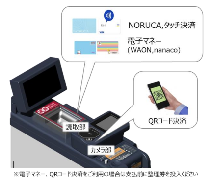 – 降車時は整理券を投入後、タッチパネルで決済手段を選択してください。QRコードはカメラにかざし、電子マネーは決済端末にかざしてください。