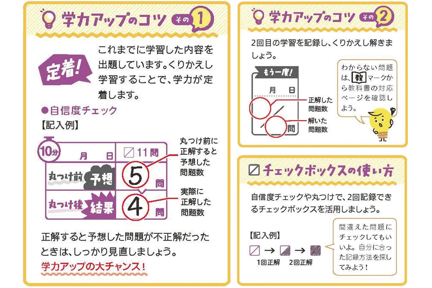 4. 復習・定着を促す「自己管理」要素 各紙面には、丸つけ前に正解しているかを予想して確認する「自信度チェック」の欄や、2回目の学習を記録できる「もう一度!」のチェックボックスを配置。ドリルの「使い方」に沿って進めるだけで、振り返りの管理がしやすくなり、重要事項をしっかりと定着させることができます。