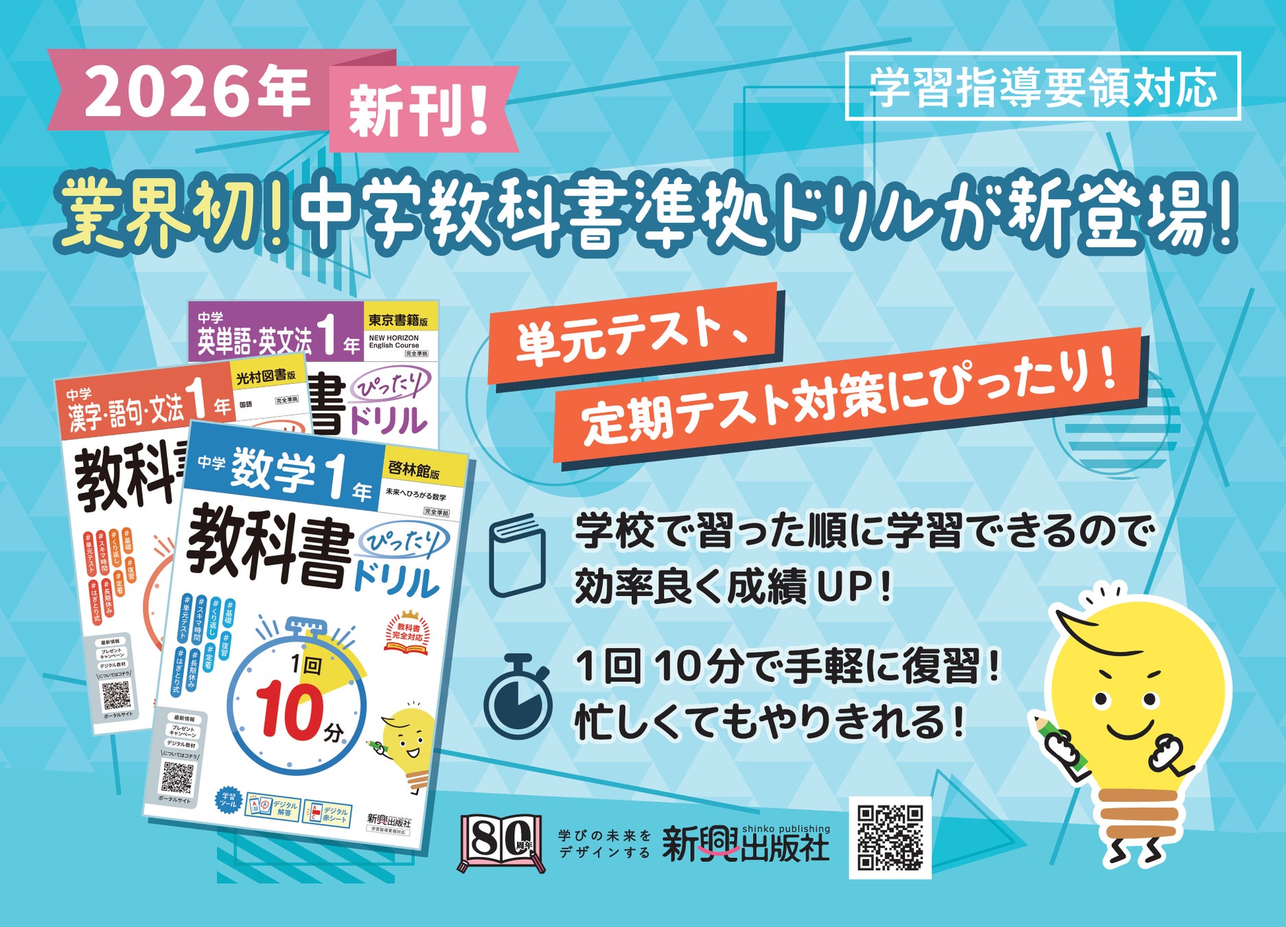 株式会社新興出版社啓林館(本社:大阪市、代表取締役社長:佐藤諭史)は、学習参考書ブランドの「新興出版社」で2026年3月中旬より 業界初となる中学生向けの教科書準拠ドリル『中学 教科書ぴったりドリル』シリーズ(中1・中2向け/全20点)を新発売いたします。近年増加傾向にある中学校の「単元テスト」や「小テスト」対策に最適な構成で、部活や塾などで忙しい中学生でも毎日のスキマ時間にサクッと取り組める「1回10分」のボリュームが特徴です。さらに、スマホを使ったデジタル学習にも対応しており、効率的な学習と知識の定着を強力にサポートします。