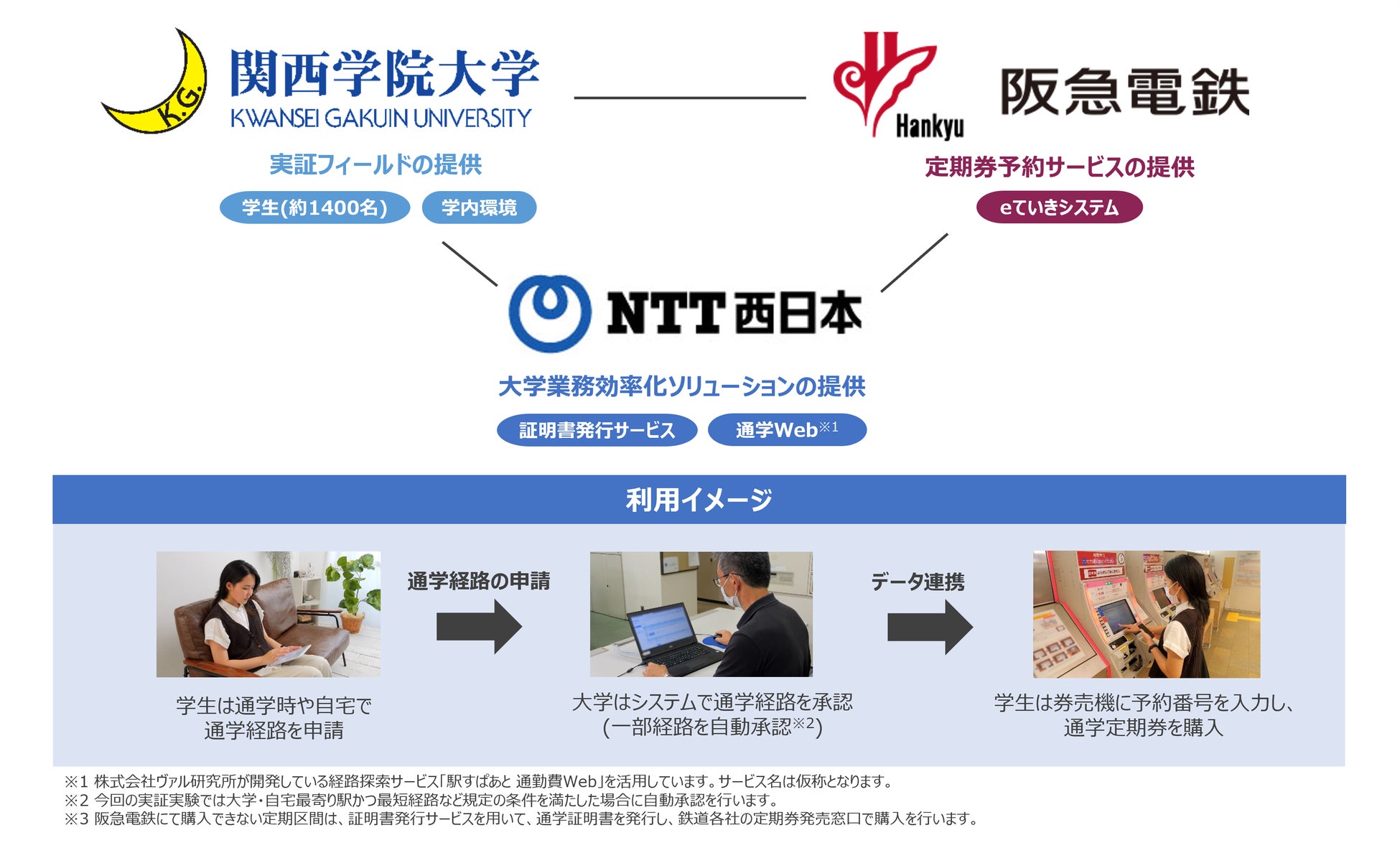 今回、全国初の試みとして、NTT西日本の証明書発行サービスから阪急電鉄の定期券インターネット予約サービス「eていき」(eていきシステム)へ通学証明のデータ連携を行い、学生が自宅等に居ながらスマートフォンなどで通学証明の発行や通学定期券のオンライン予約をし、券売機で通学定期券を購入できるサービスをトライアル提供します。この実証実験を通じて、学生向けサービスの利便性向上や大学・駅係員の業務効率化、駅窓口の混雑緩和等に対する有効性を検証します。