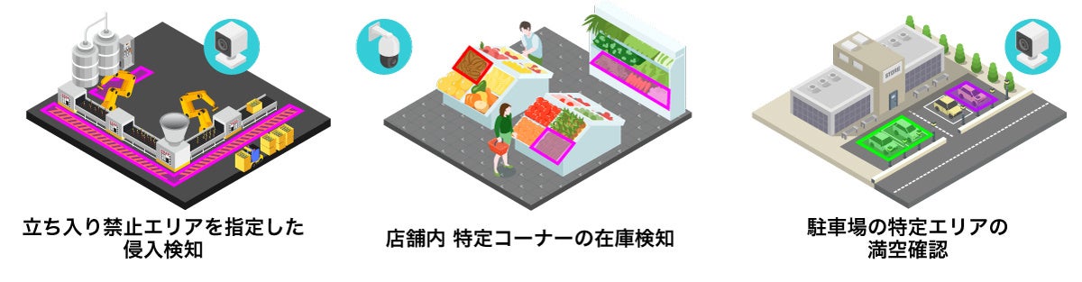 例えば、売り場の映像に対して、惣菜コーナー、特売コーナーなど売り場の見たい箇所を複数指定して在庫状況や人の滞留状況をAIで分析し、通知することができます。製造業や建設現場においては、立ち入り不可エリアへの不正侵入の有無の通知、また、建物管理においては、駐車場敷地内の複数のエリアを指定して、総合的な駐車状況の通知など、現場の確認作業を減らす用途にも活用できます。