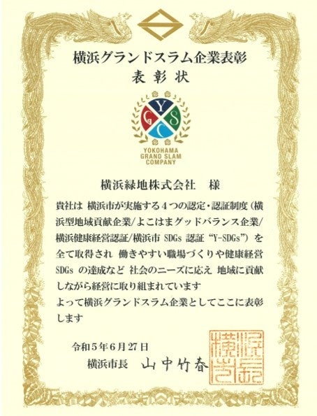 横浜市が実施する4つの認定・認証制度である「横浜型地域貢献企業」、「よこはまグッドバランス企業(旧よこはまグッドバランス賞)」、「横浜健康経営認証」、「横浜市SDGs認証制度“Y-SDGs”」のすべてを取得した企業が対象となるもので、横浜緑地株式会社はこの初の表彰企業79社の一つとして表彰されました。
