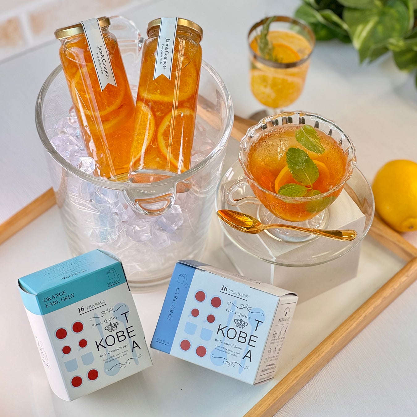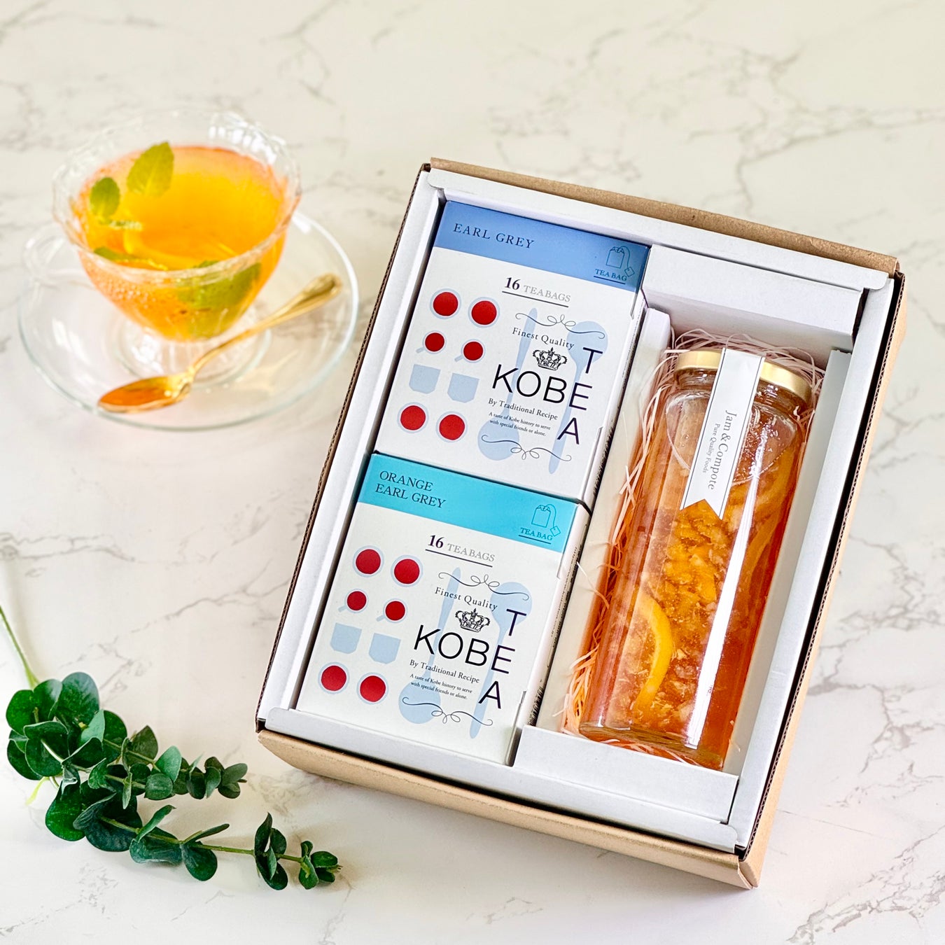 神戸紅茶の生紅茶(きこうちゃ)からアールグレイとオレンジアールグレイ、樽正からは爽やかなレモネードが楽しめる蜂蜜レモネードの詰め合わせギフトです。