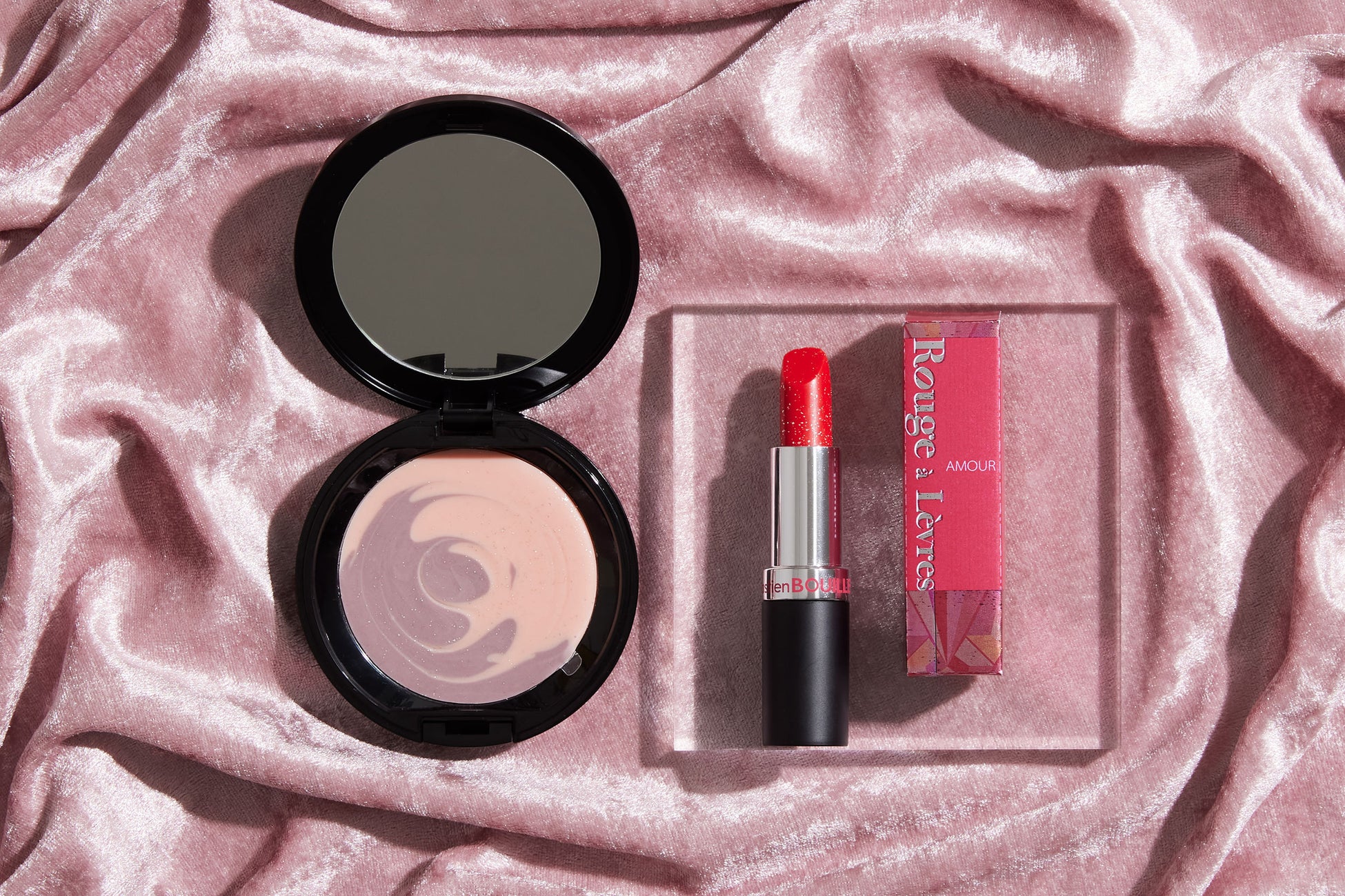 チークのように鮮やかなタブレットショコラとルージュ型ショコラの詰め合わせ。