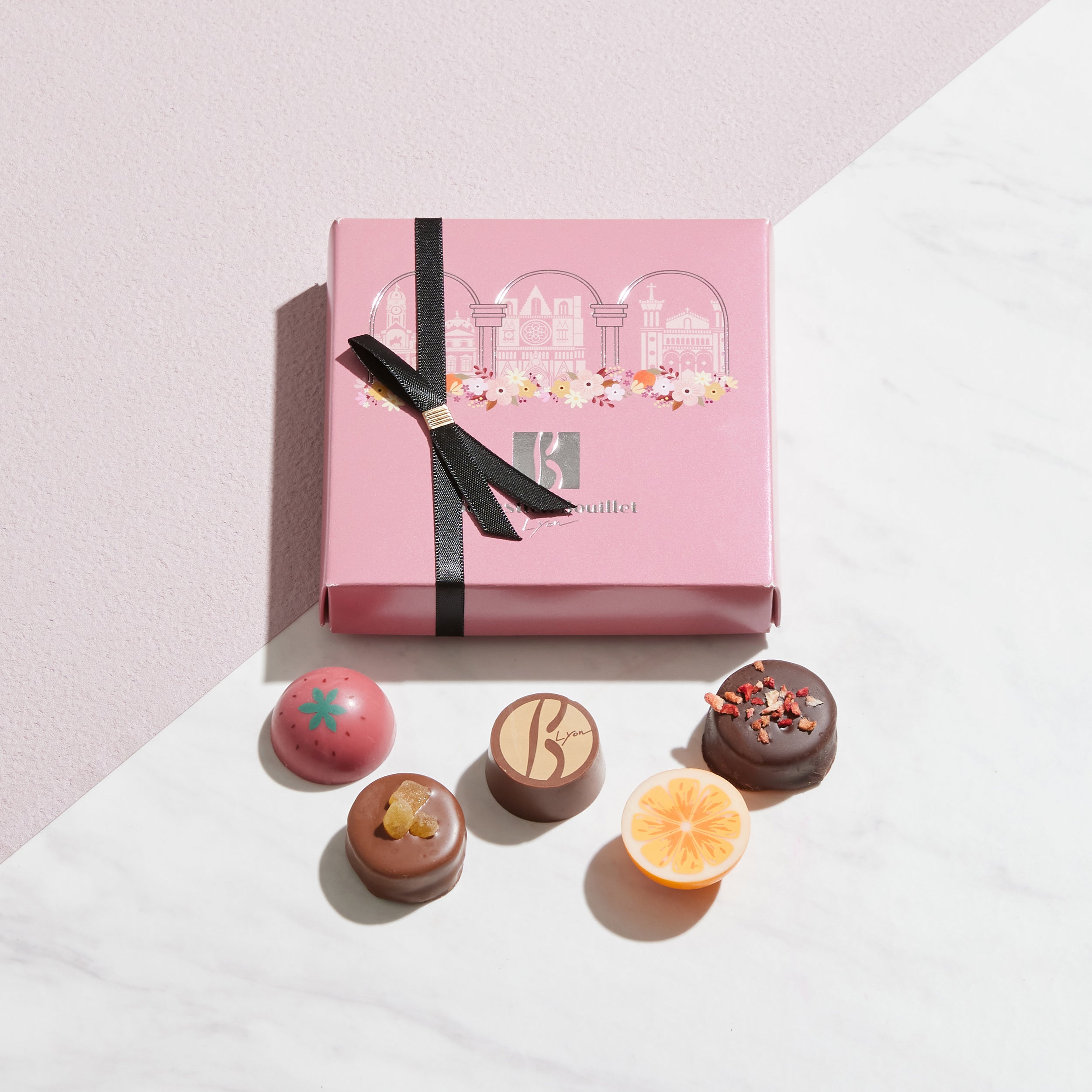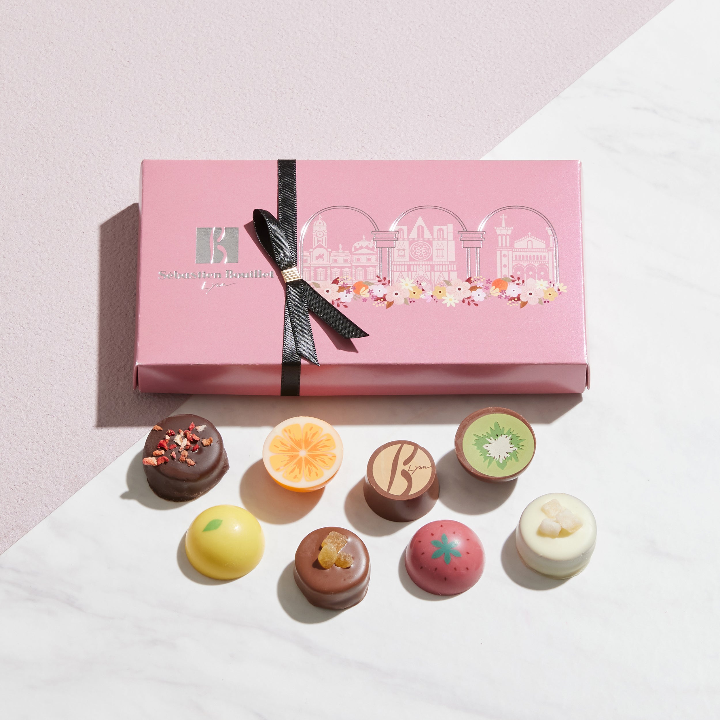 フランス リヨンモチーフのプリントが華やかなショコラに抹茶や柚子、ごまなど日本らしさを感じるフレーバーを合わせました。