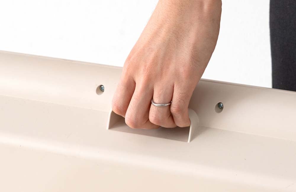 奥行き18cmのスリムな設計になっているのでキッチンやデスク下、脱衣所等様々な場所で使用していただくことができます。また重量は約3.8kgと軽く、本体上部にとってもついているので移動も楽に行うことが可能です。