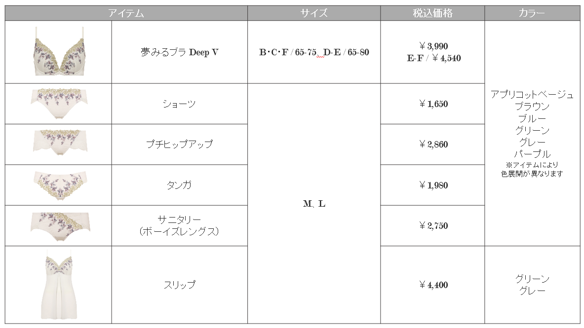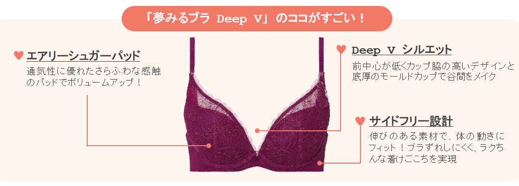- ブラジャーはくっきり谷間の「夢みるブラ Deep V」がエントリー。 人気ショーツ「プチヒップアップ」とのコーディネートでスタイルアップ!