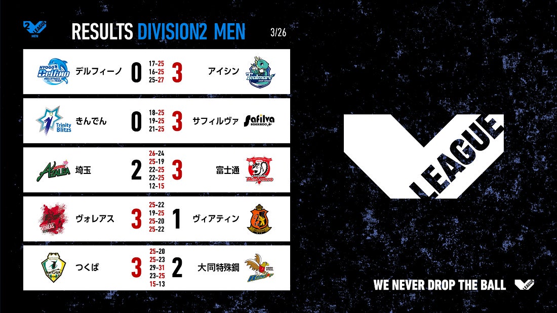 優勝 ー V1男子:ウルフドッグス名古屋、V1女子:東レアローズ、V2男子:ヴォレアス北海道、V3男子:トヨタ自動車サンホークス