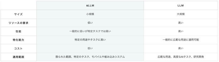 従来のLLM、例えばGPT-3やBERTのようなモデルは、巨大なデータセットを用いて訓練され、一般化された言語理解能力を持っています。これに対し、sLLM(小さいLLM)はより限られたデータセットで訓練され、特定のタスクやドメインに焦点を当てています。このため、LLMよりも訓練や運用のコストが低い反面、一般化されたタスクに対する適応能力は低い場合があります。しかし、特定の用途やニーズに合わせてカスタマイズされたsLLMは、その領域においてはLLMよりも高い効率と精度を発揮することができます。