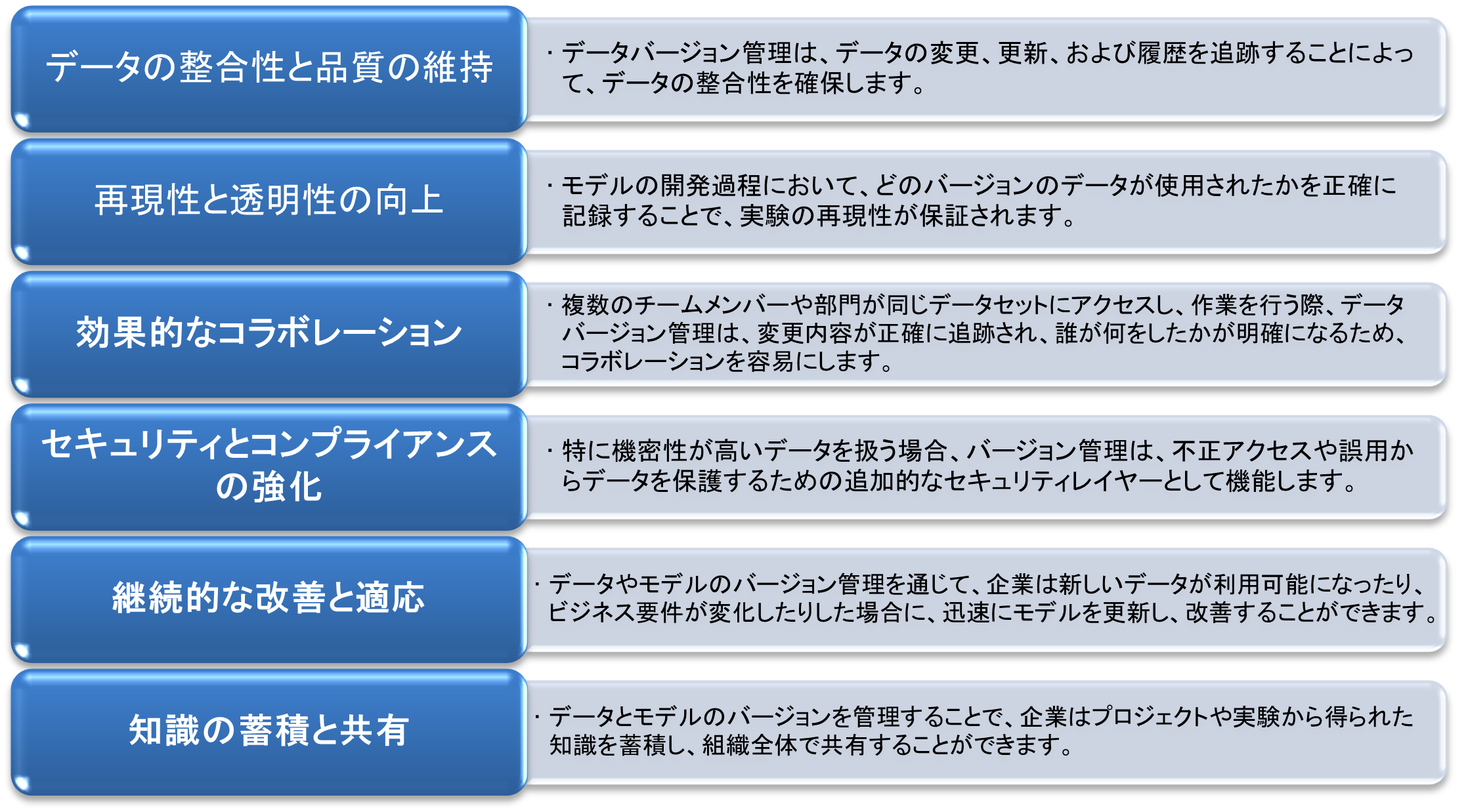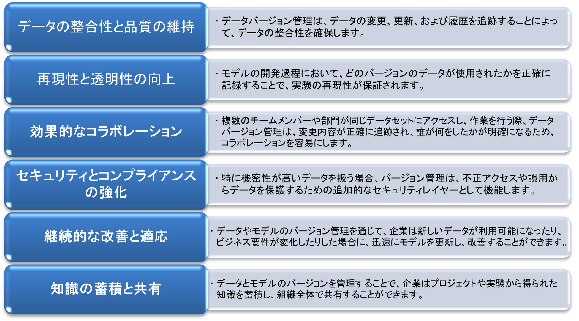 データの整合性の維持: 学習データのバージョン管理により、データの変更履歴を追跡し、どのデータセットを使用してどの結果が得られたかを正確に把握できます。これは、モデルの品質保証と結果の再現性に不可欠です。