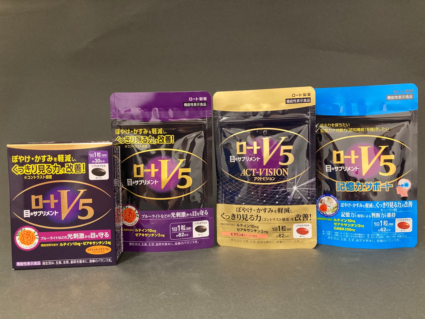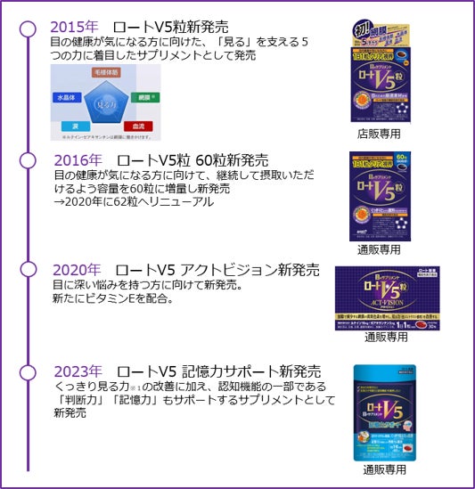 2015年に、年齢とともに目のお悩みが出てきた方への新たなご提案として、見る力を支える5つの要素から網膜に着目し、くっきり見る力※1をサポートする成分を配合した当社初の機能性表示食品として、目のサプリメント「ロートV5粒」を発売しました。以降、お客様の抱える目の悩みや生活習慣の変化に応じた提案を行い、現在では「ロートV5b 30粒」「ロートV5b 60粒」「ロートV5アクトビジョンa 62粒」「ロートV5 記憶力サポート 62粒」の合計4品のシリーズで発売しています。シリーズを通して、1日1粒(目安)で続けやすいソフトカプセルで喉に引っかかりにくく飲みやすい設計にこだわり、発売当初より多くのお客様にご支持いただき、ロート通販内売り上げNo.1※3ブランドに成長しています。