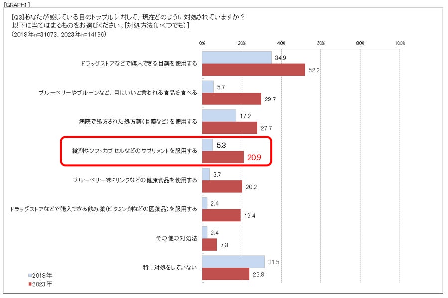 当社が2018年に実施した調査※4と2023年に実施した調査※5によると、2018年の調査時には自身の目の悩みへの対処法としてサプリメントを選択された方は5%だったのに対し、5年後の2023年調査時では20%となり、4倍に増えています(GRAPH1参照)。この背景には、新型コロナウイルス感染症の流行による環境の変化などにより、デジタルデバイスの使用時間が増えたことで目に感じる悩みが複合的になったというお声もあり、お客様が抱える目のお悩みが深刻化していたり、対処法を探し求める方が増えていることが示唆されます。