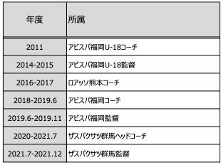 アビスパ福岡U-18コーチ - アビスパ福岡U-18監督 - ロアッソ熊本コーチ - アビスパ福岡コーチ - アビスパ福岡監督 - ザスパクサツ群馬ヘッドコーチ - ザスパクサツ群馬監督
