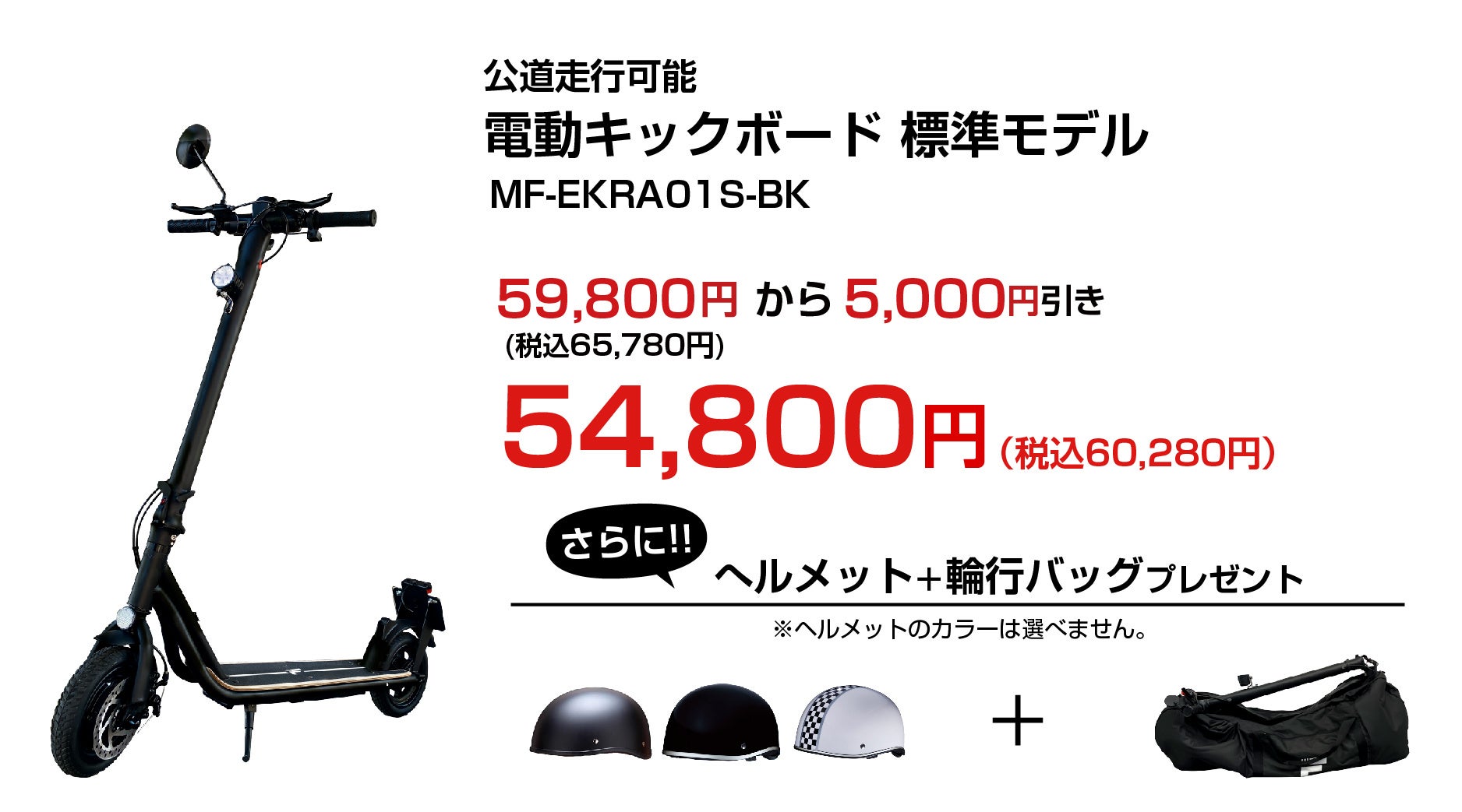 - 最もスタンダードで運転操作がシンプルな公道対応モデル 電動キックボード MF-EKRA01S-BK 通常価格 65,780円(税込)→特別価格 60,280円(税込)