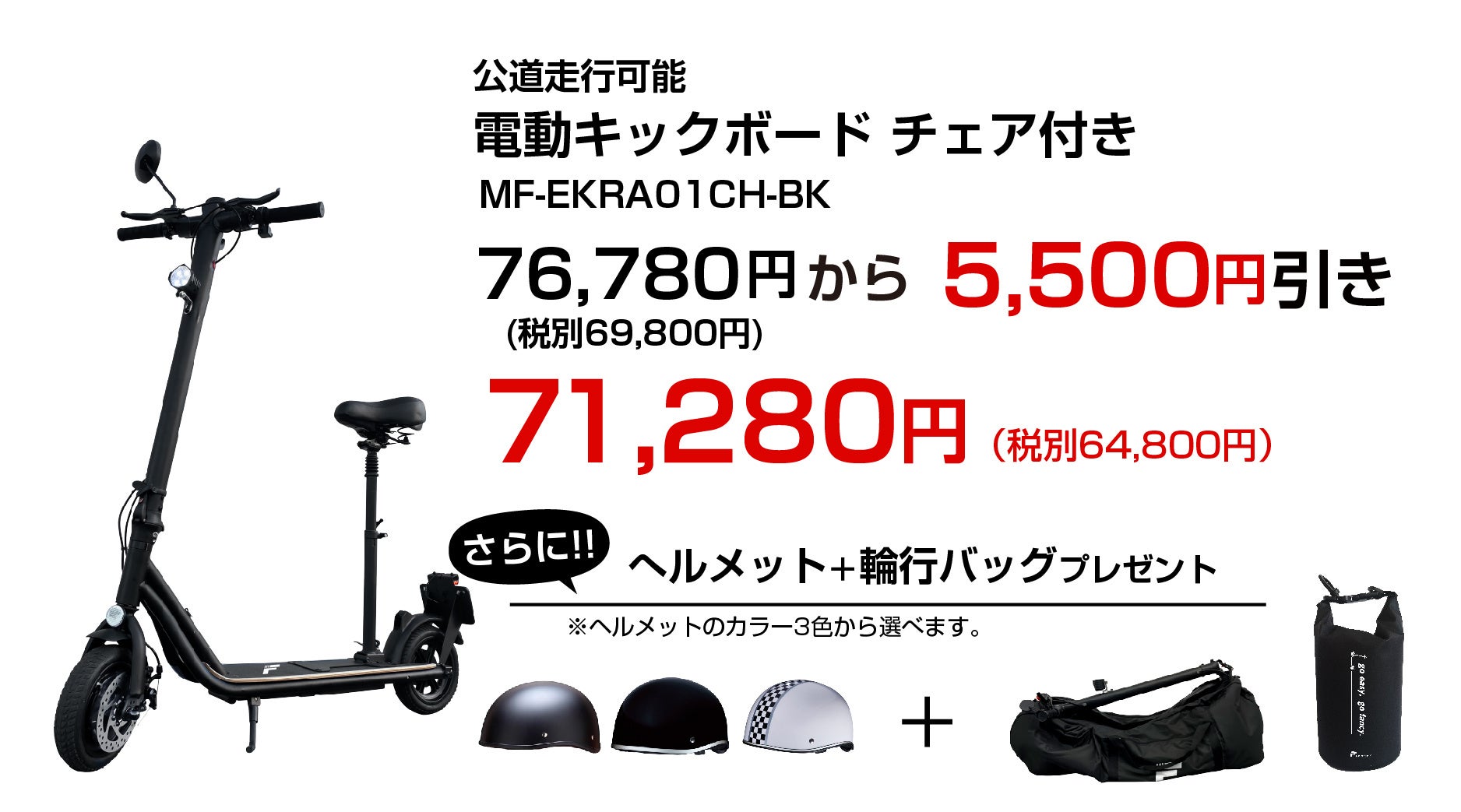 - 安定した走行感が魅力の公道走行対応モデル チェア付き電動キックボード MF-EKRA01CH-BK 通常価格 76,780円(税込)→特別価格71,280円(税込)