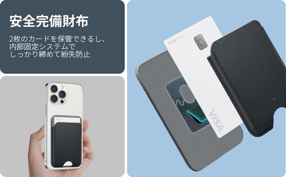 最大カード2枚まで収納可能で、1枚収納時にも内部固定設計による安全な収納が可能